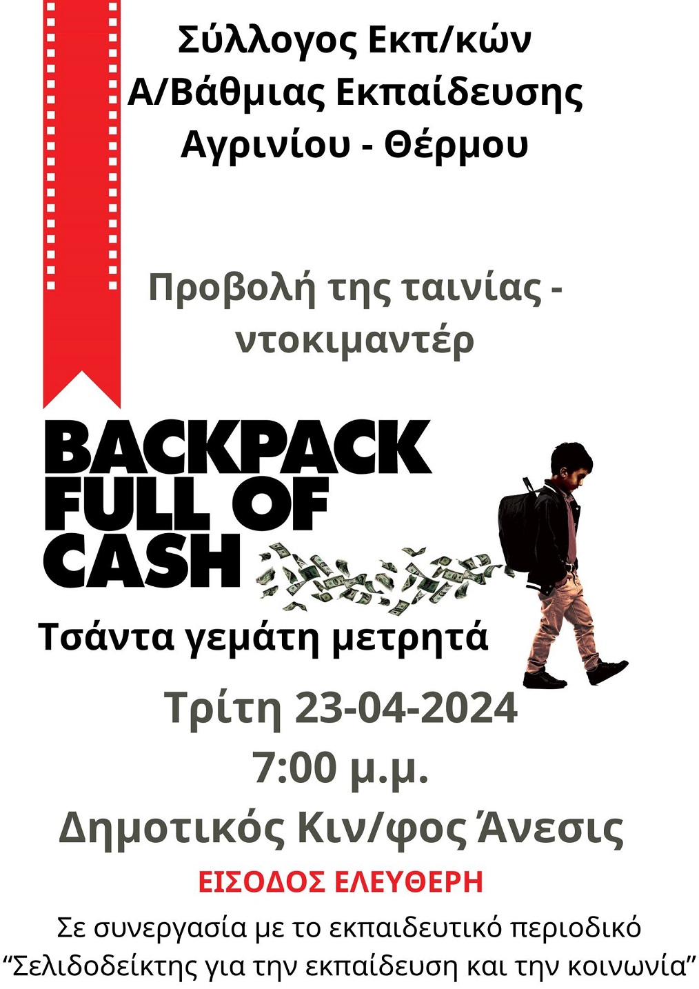 Ο Σύλλογος Εκπαιδευτικών Πρωτοβάθμιας Εκπαίδευσης Αγρίνιου - Θέρμου, σε συνεργασία με το εκπαιδευτικό περιοδικό «Σελιδοδείκτης για την εκπαίδευση και την κοινωνία» που εξασφάλισε και την παρουσίαση της ταινίας - ντοκιμαντέρ, διοργανώνει την προβολή της ταινίας «Backpack full of cash» (Σχολική τσάντα γεμάτη λεφτά) την Τρίτη, 23 Απριλίου 2024 στις 7:00 μ.μ. στον Δημοτικό Κινηματογράφο "Άνεσις.