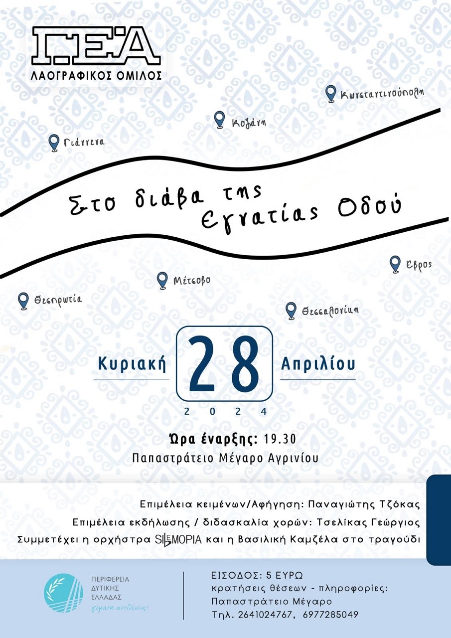 "Στο διάβα της Εγνατίας οδού" είναι ο τίτλος της μεγάλης μουσικοχορευτικής παράστασης που διοργανώνεται από τον Λαογραφικό Όμιλο της Γυμναστικής Εταιρείας Αγρινίου (ΓΕΑ), την Κυριακή 28 Απριλίου 2024 και ώρα 19:30 μ.μ. στο Παπαστράτειο Μέγαρο της Γυμναστικής Εταιρείας Αγρινίου.