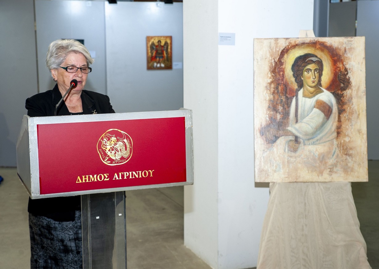 Η κυρία Τσιρώνη καλωσόρισε τους επισκέπτες ευχαριστώντας τον Δήμο Αγρινίου και τον κο Χρήστο Γαρουφαλή για την πολλαπλή στήριξή του στην οργάνωση της έκθεσης. Στη συνέχεια η Θεολόγος κα Ευαγγελία Λύσσαρη έκανε γενική αναφορά στο νόημα της βυζαντινής εικονογραφίας συνδυάζοντάς το με τα έργα της έκθεσης, τα οποία όπως ανέφερε, μέσω των χρωμάτων, εκφράζουν ευλάβεια και αρμονία και έχουν απώτερο στόχο την πραγμάτωση της καθαρά πνευματικής αποστολής των μορφών.