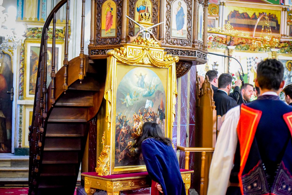 Πριν την απόλυση του Εσπερινού ο Σεβασμιώτατος Ποιμενάρχης μας κ. Δαμασκηνός παρουσίασε τους Αγίους Αρχιερείς στους άρχοντες και τον λαό και τους ευχαρίστησε, γιατί λαμπρύνουν με την παρουσία τους τις φετινές Εορτές Εξόδου.