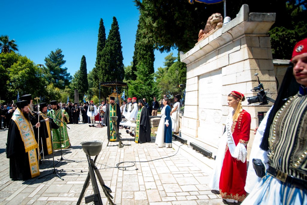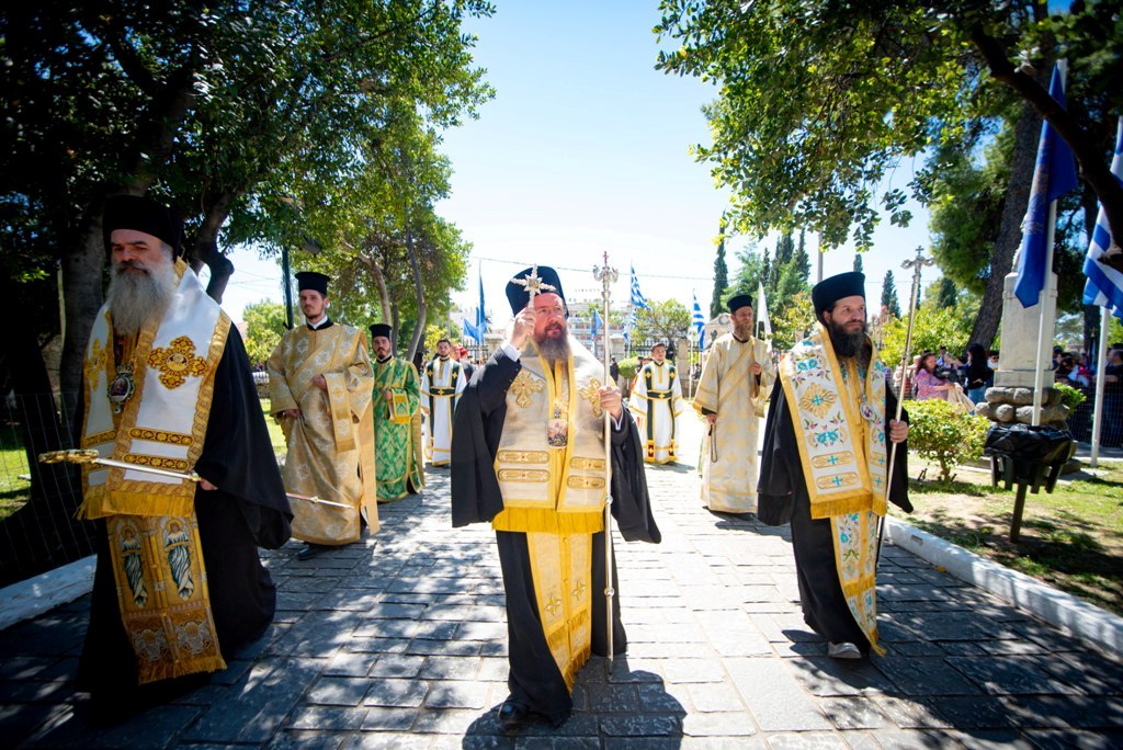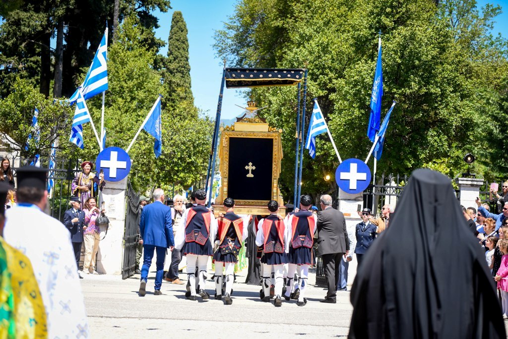 Με την ιερά λιτανεία μεταφέρθηκε η Εικόνα της Εξόδου, το Ιερό Λάβαρο και ο Σταυρός Ευλογίας του Επισκόπου Ρωγών Ιωσήφ, στον Κήπο των Ηρώων της Ιεράς Πόλεως.