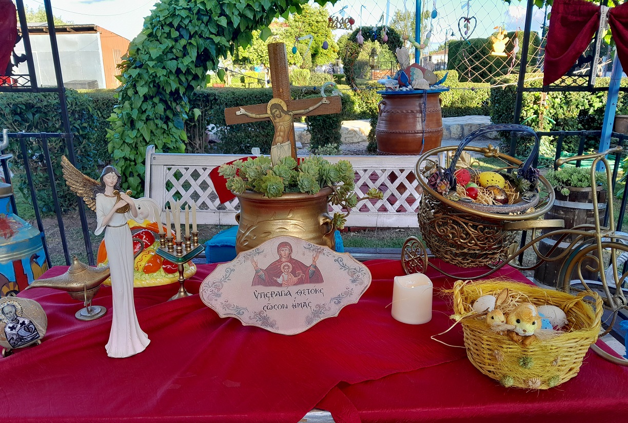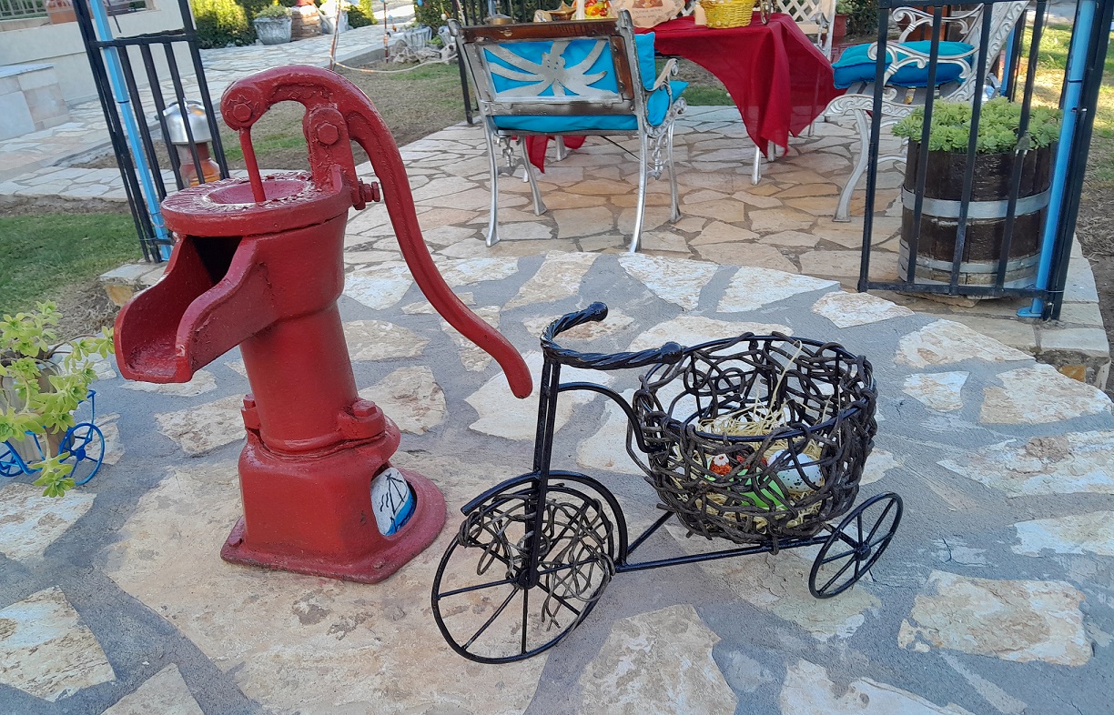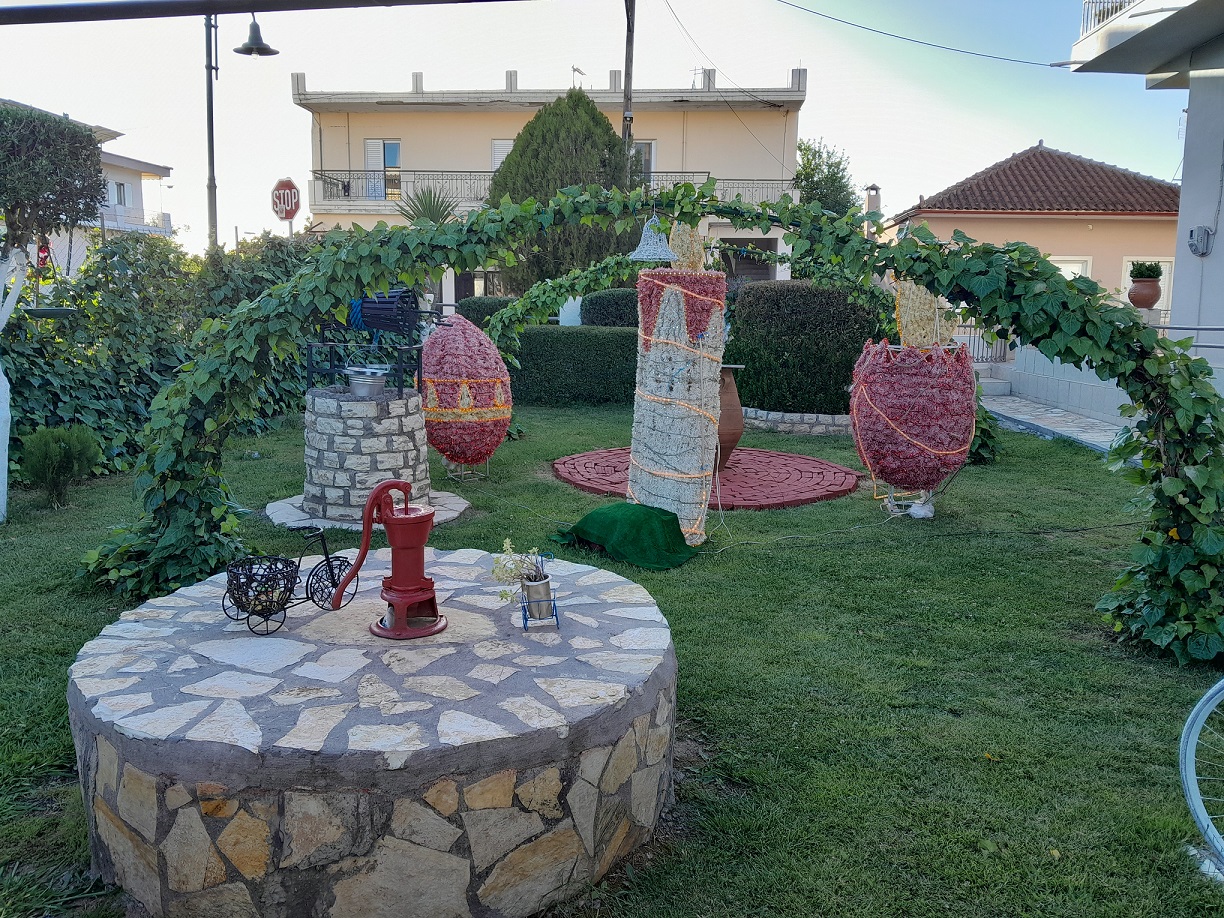 Πράγματι μοιάζει σαν ένα μικρό θεματικό πάρκο, με μεγάλα διακοσμητικά αυγά, με συνθέσεις λουλουδιών και πολύχρωμων βαμμένων αυγών κρεμασμένα στο κιόσκι ή στο φράκτη, τοποθετημένα δίπλα στα παλιά αντικείμενα που έχει συγκεντρώσει με προσωπικό κόπο, η κυρία Νίκα, ενώ ένα παλιό ποδήλατο και μια βρύση (τρόμπα) ξεχωρίζουν ανάμεσα στα άλλα κομμάτια της συλλογής της…