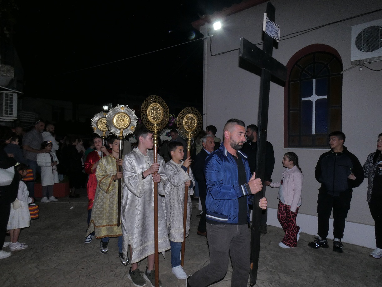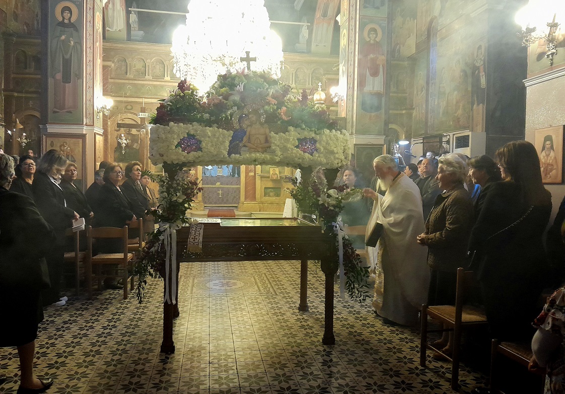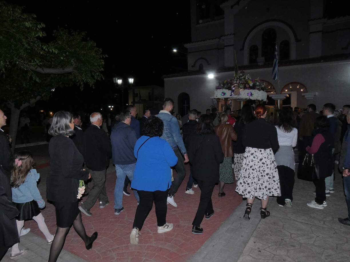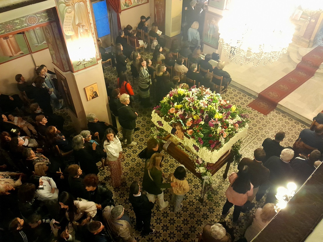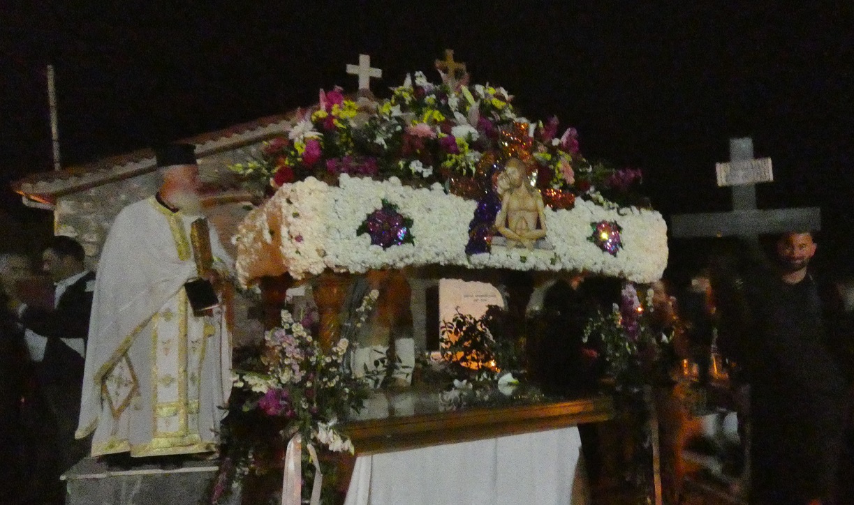 Στη συνέχεια οι πιστοί, ακολούθησαν την περιφορά του Επιταφίου ο οποίος ήταν στολισμένος με πολύχρωμα λουλούδια, γύρω από το ναό, και κατευθύνθηκαν προς το εξωκλήσι του παλαιού Ι.Ν. Αγίου Νικολάου.