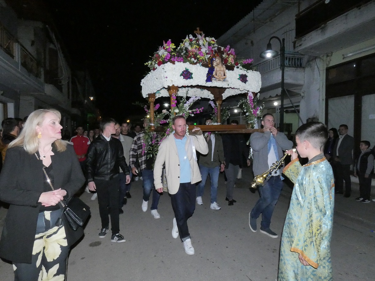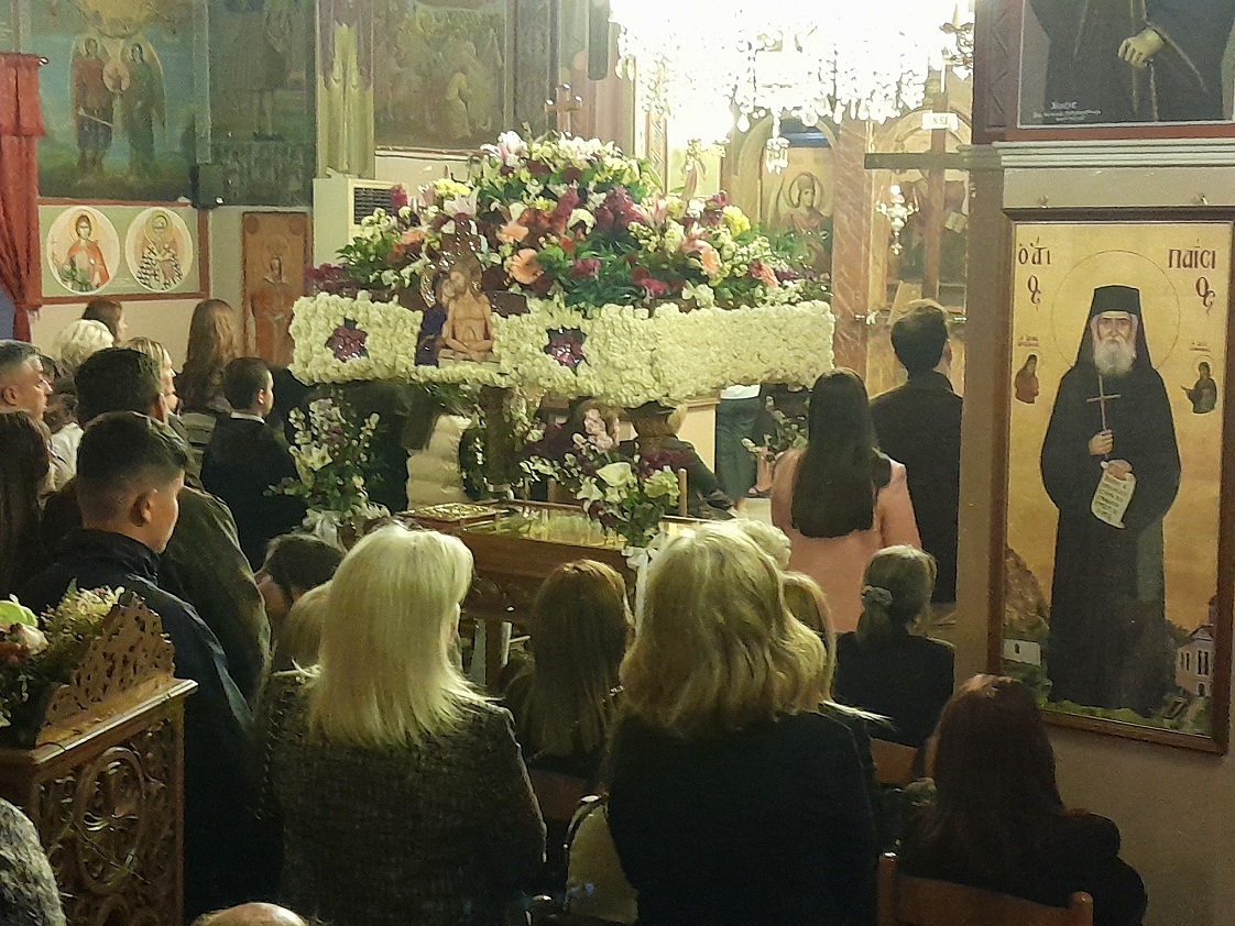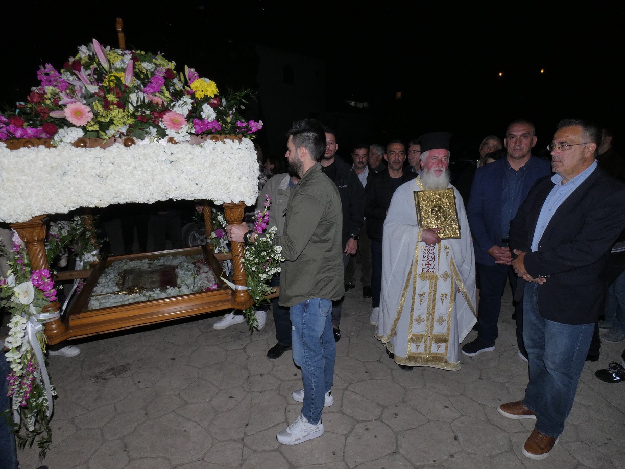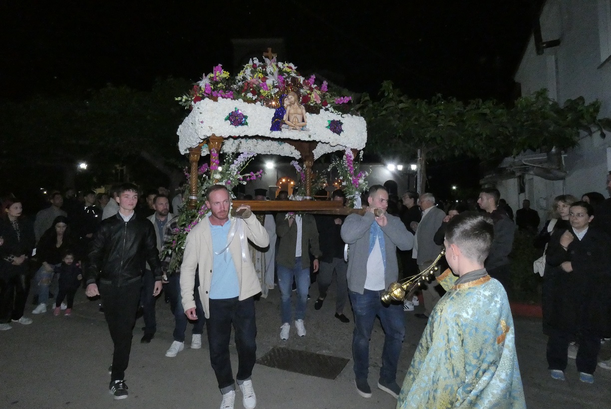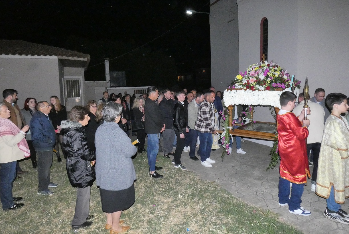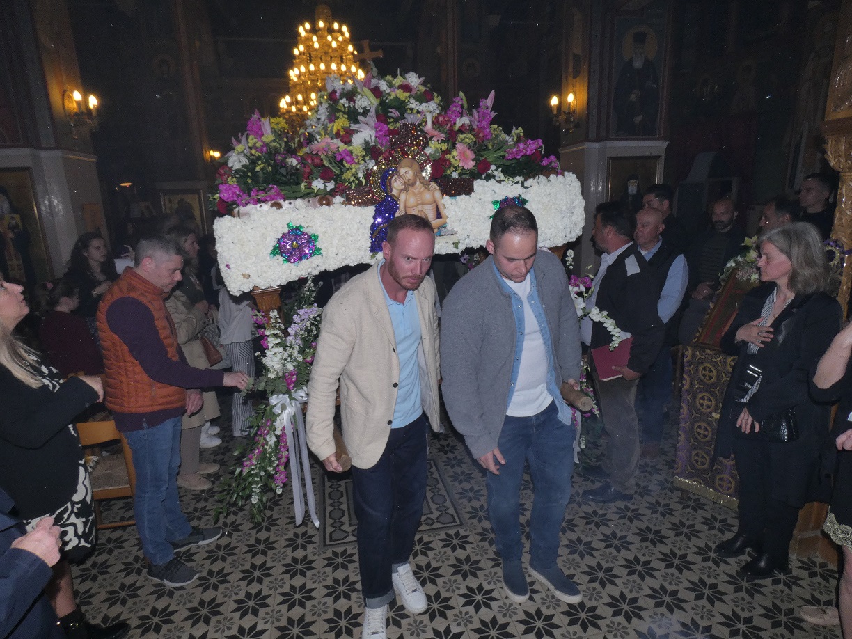 Στη συνέχεια οι πιστοί, ακολούθησαν την περιφορά του Επιταφίου ο οποίος ήταν στολισμένος με πολύχρωμα λουλούδια, γύρω από το ναό, και κατευθύνθηκαν προς το εξωκλήσι του παλαιού Ι.Ν. Αγίου Νικολάου.