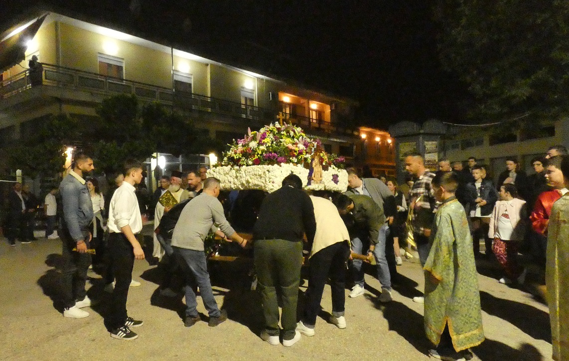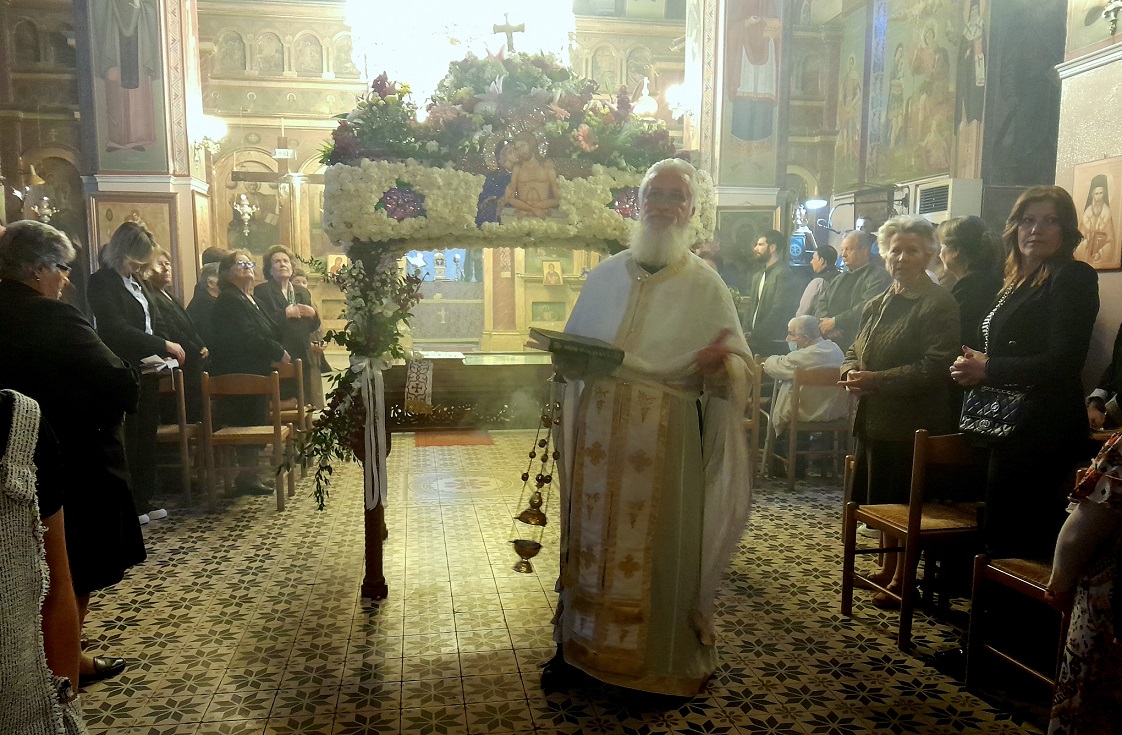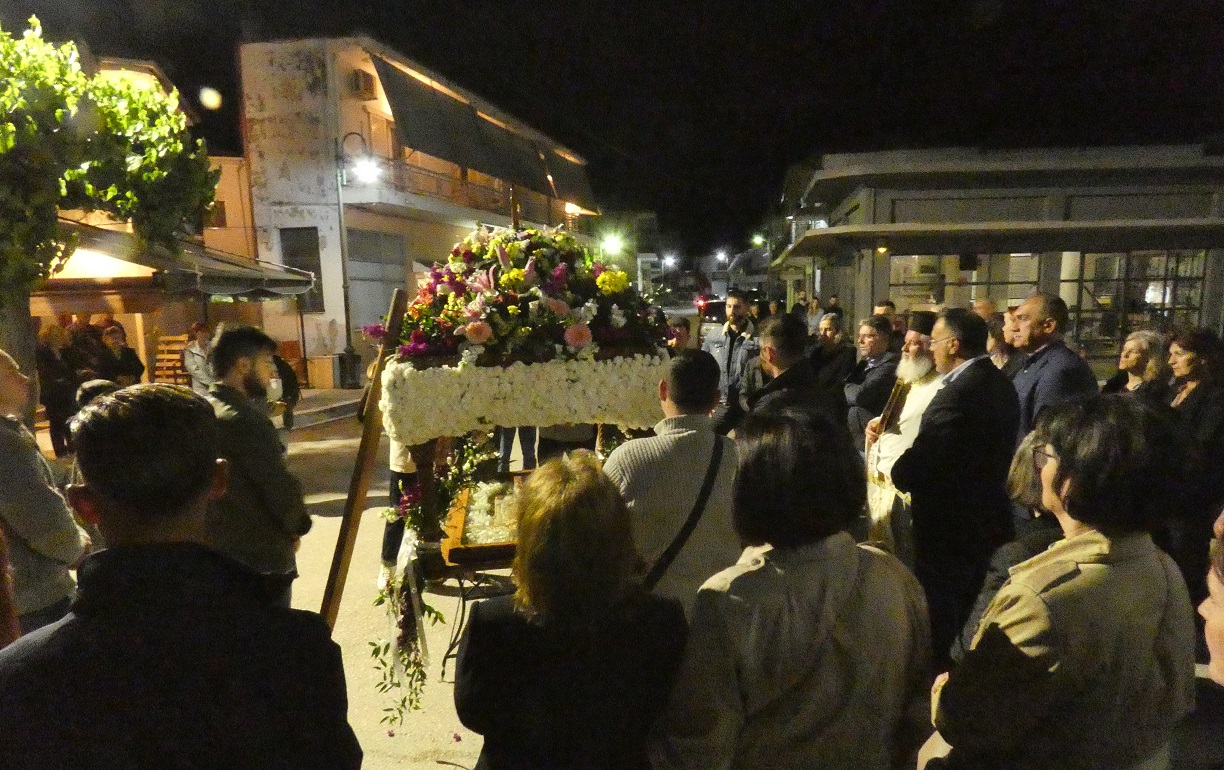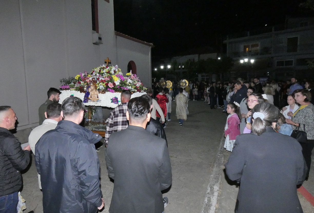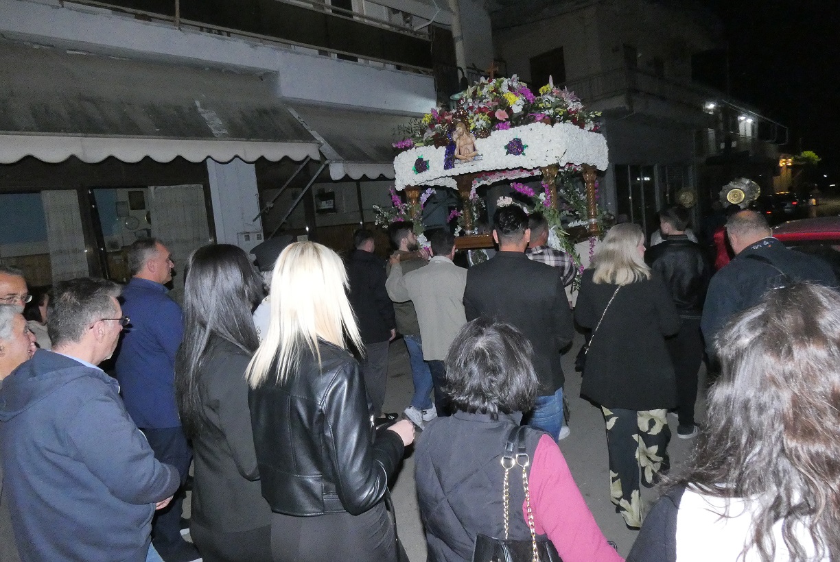 Στη συνέχεια οι πιστοί, ακολούθησαν την περιφορά του Επιταφίου ο οποίος ήταν στολισμένος με πολύχρωμα λουλούδια, γύρω από το ναό, και κατευθύνθηκαν προς το εξωκλήσι του παλαιού Ι.Ν. Αγίου Νικολάου.