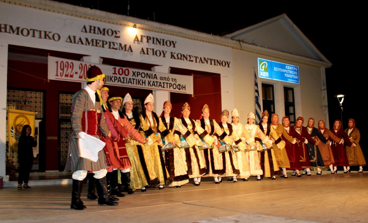 20.00 Παραδοσιακοί χοροί από τον Σύλλογο Ποντίων Ν. Αιτωλοακαρνανίας «Δ. Ψαθάς», τον Σύλλογο Μικρασιατών Προσφύγων Ν. Αιτωλοακαρνανίας τον Σύλλογο Πραμαντιωτών, των τμημάτων Αγίου Κωνσταντίνου, Δήμου Αγρινίου και του Κ.Α.Π.Η