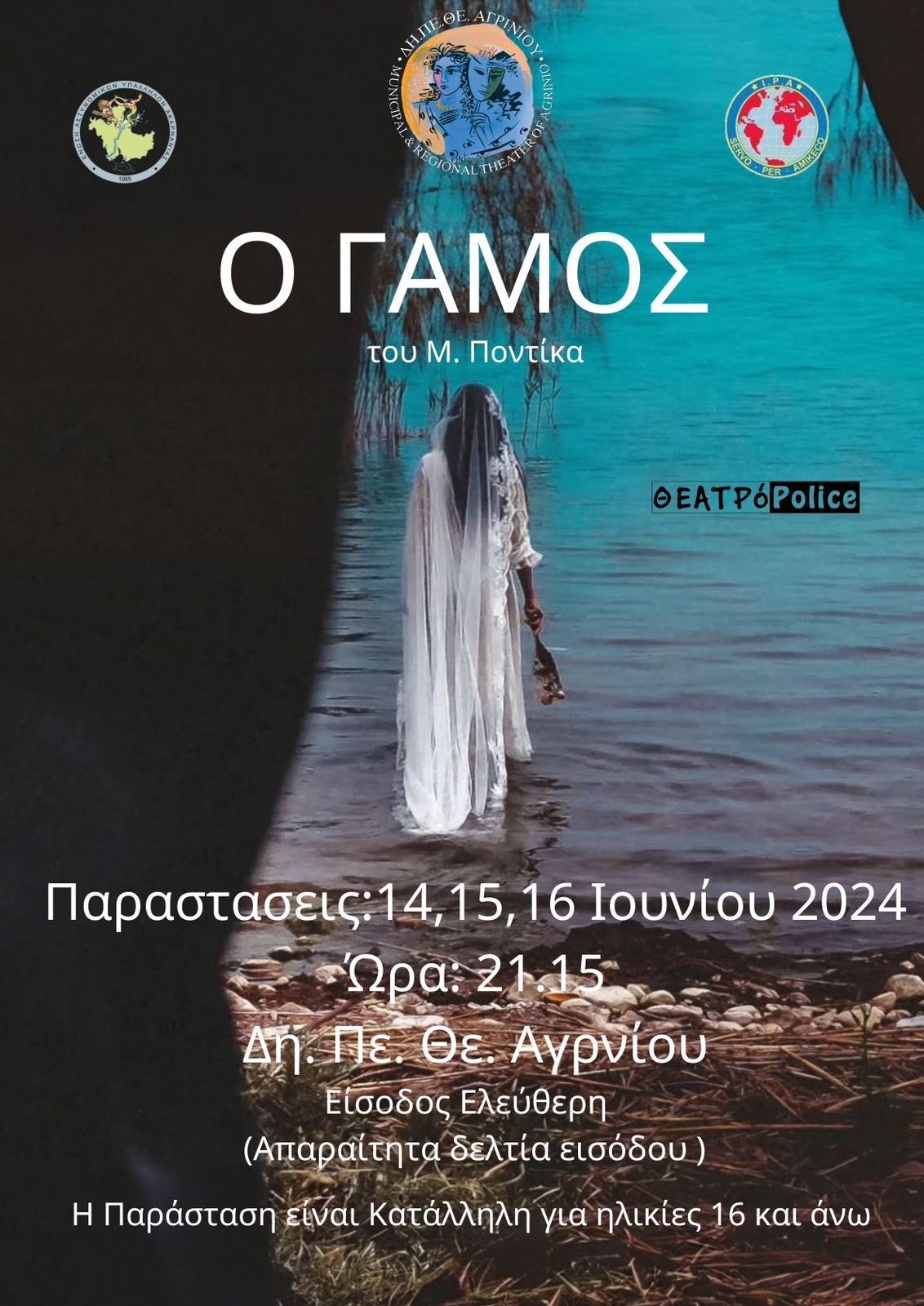 Το Δη.Πε.Θε. Αγρινίου και η ερασιτεχνική θεατρική ομάδα ΘΕΑΤΡό Police της Ένωσης Αστυνομικών Υπαλλήλων Ακαρνανίας και της Τοπικής Διοίκησης Ακαρνανίας της Διεθνούς Ένωσης Αστυνομικών, συνεργάζονται για δέκατη συνεχόμενη χρονιά, παρουσιάζοντας το έργο του Μάριου Ποντίκα «Ο ΓΑΜΟΣ» την Παρασκευή 14,το Σάββατο 15 και την Κυριακή 16 Ιουνίου 2024, στις 21:15 μ.μ. στην αίθουσα του θεάτρου.