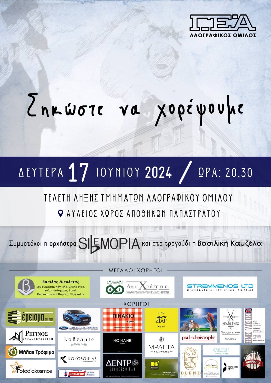 «Σηκώστε να χορέψουμε…» ο τίτλος της τελετής λήξης όλων των τμημάτων του Λαογραφικού Ομίλου της Γυμναστικής Εταιρείας Αγρινίου, που θα λάβει χώρα στον αύλειο χώρο των αποθηκών Παπαστράτου στο Αγρίνιο, την Δευτέρα 17 Ιουνίου 2024 και ώρα 20:30.