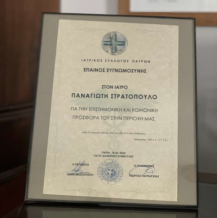 Την Παρασκευή 7 Ιουνίου 2024, στο Συνεδριακό και Πολιτιστικό Κέντρο του Πανεπιστημίου Πατρών, έλαβε χώρα εκδήλωση - τελετή βράβευσης της Ιατρικής Σχολής του Πανεπιστημίου Πατρών και του Ιατρικού Συλλόγου Πατρών, στην οποία μεταξύ άλλων ιατρών, βραβεύτηκε και ο συγχωριανός μας Ιατρός Πνευμολόγος, Παναγιώτης Κων. Στρατόπουλος, για την διαχρονική προσφορά του στην Κοινωνία και στον Άνθρωπο.