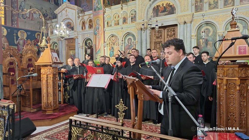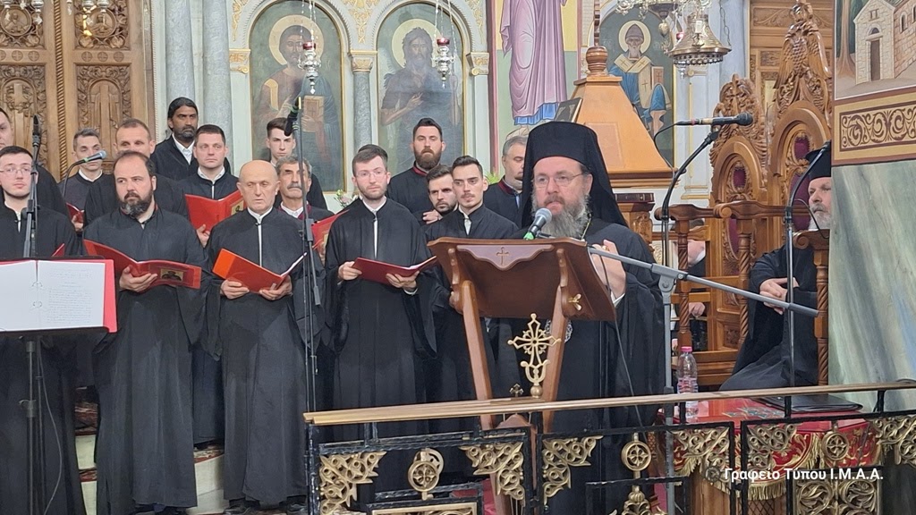 Κατά τον χαιρετισμό ο Σεβασμιώτατος Μητροπολίτης Αιτωλίας και Ακαρνανίας κ. Δαμασκηνός καλωσόρισε θερμά τον Μουσικολογιώτατο Άρχοντα Πρωτοψάλτη κ. Παπαδόπουλο, «ένα άνθρωπο, τον οποίο αγαπάμε πολύ και σεβόμαστε υπερβαλλόντως, που κοσμεί κυριολεκτικά με την παρουσία του και την ιεροπρέπειά του το πρώτο Αναλόγιο της Ελλαδικής Εκκλησίας».