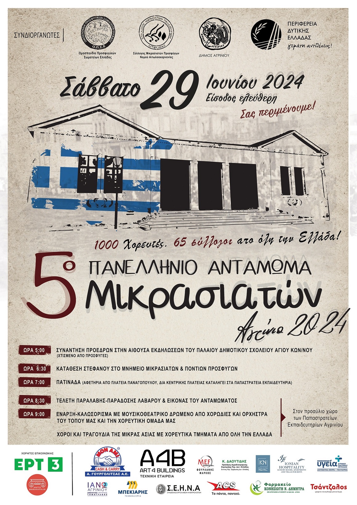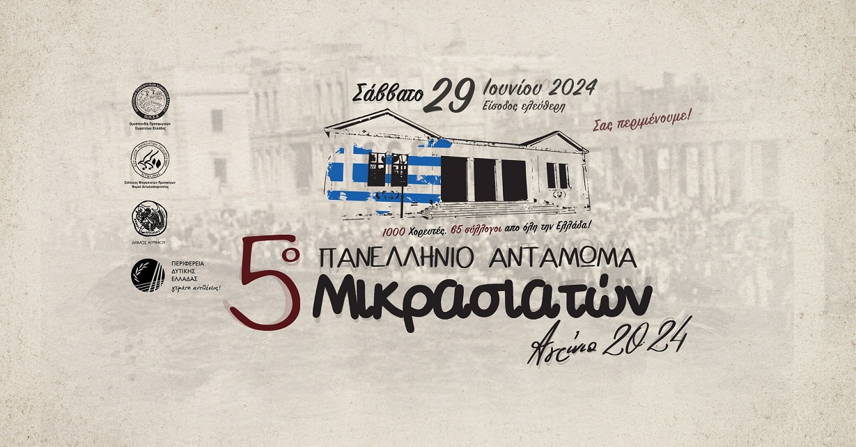 Έχουμε την χαρά και την τιμή να καλοσωρίσουν το 5ο ΠΑΝΕΛΛΗΝΙΟ ΑΝΤΑΜΩΜΑ ΜΙΚΡΑΣΙΑΤΩΝ με μουσικό δρώμενο,με την συμμετοχή της χορωδίας του Δήμου Αγρινίου Ιάμβη,της χορωδίας του συλλόγου μας,της χορωδίας του Εργαστηρίου Παναγία Ελεούσα και του μουσικού συνόλου ΗΧΩ,στο οποίο θα συμμετέχει και το τμήμα παραστάσεων του συλλόγου μας.