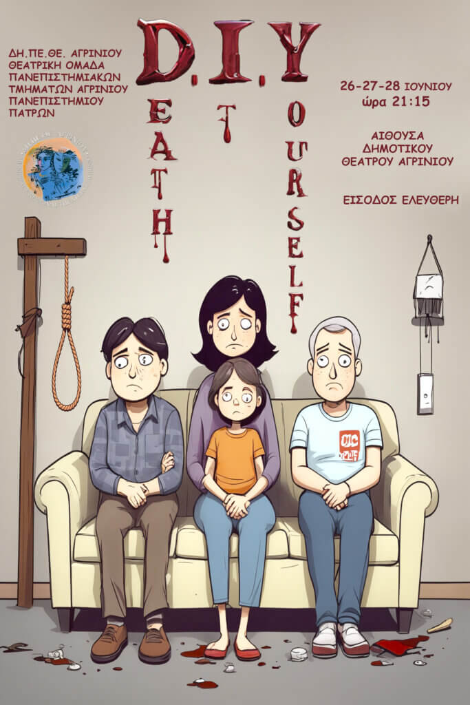 Το Δη.Πε.Θε. Αγρινίου και η Θεατρική Ομάδα Πανεπιστημιακών Τμημάτων Αγρινίου - Πατρών, συνεργάζονται για 18η συνεχή χρονιά παρουσιάζοντας την παράσταση «Death It Yourself» στις 26, 27 και 28 Ιουνίου 2024 στις 9.15 μ.μ. στην αίθουσα του Δημοτικού Θεάτρου.