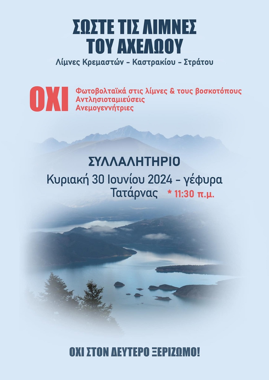 Ενάντια στη καταστροφή ολόκληρης της υπαίθρου των Δήμων Αγράφων, Αγρινίου και Αμφιλοχίας, από την επέλαση κάθε μορφής ανανεώσιμων πηγών ενέργειας και με κεντρικό σύνθημα «Σώστε τις λίμνες του Αχελώου - Όχι στον δεύτερο ξεριζωμό» η Επιτροπή Αγώνα Ευρυτάνων και Αιτωλοακαρνάνων καλεί τους πολίτες σε συμμετοχή, στο συλλαλητήριο που θα πραγματοποιηθεί την Κυριακή 30 Ιουνίου 2024 και ώρα 11:30 π.μ. στη γέφυρα Τατάρνας.