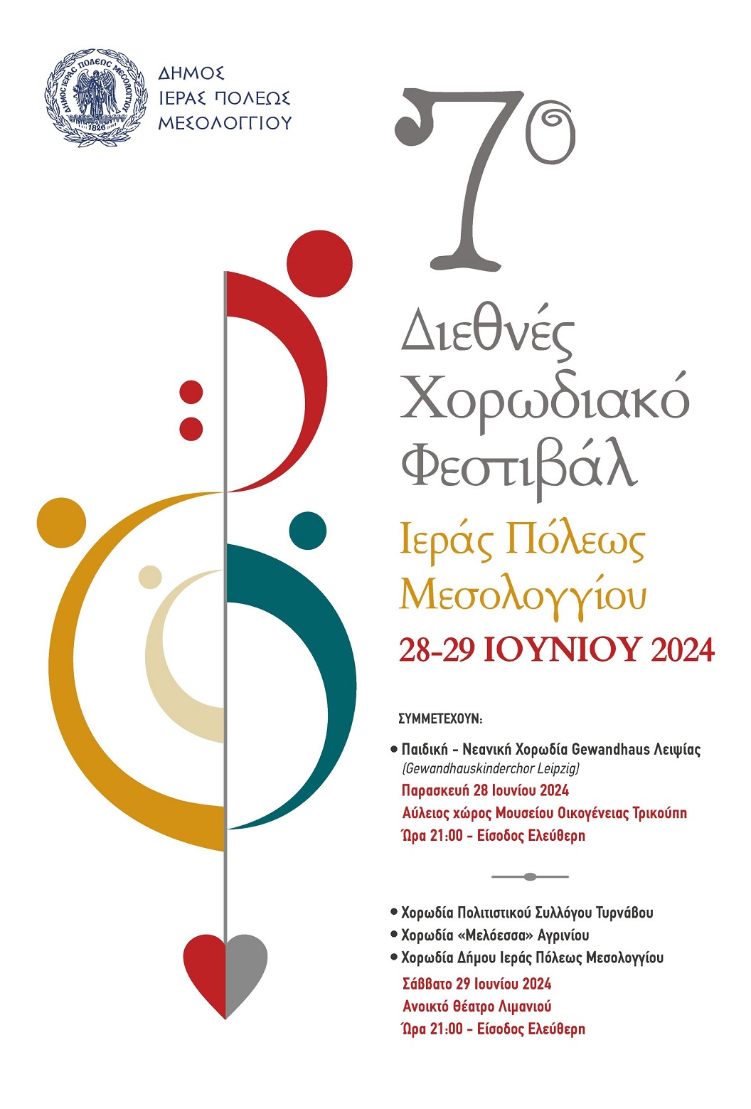 Ο Δήμος Ιερής Πόλης Μεσολογγίου σας προσκαλεί στο 7ο Διεθνές Χορωδιακό Φεστιβάλ που θα πραγματοποιηθεί την Παρασκευή 28 και το Σάββατο 29 Ιουνίου 2024 στο Μεσολόγγι, με τη συμμετοχή της Χορωδίας του Δήμου Ιερής Πόλης Μεσολογγίου.