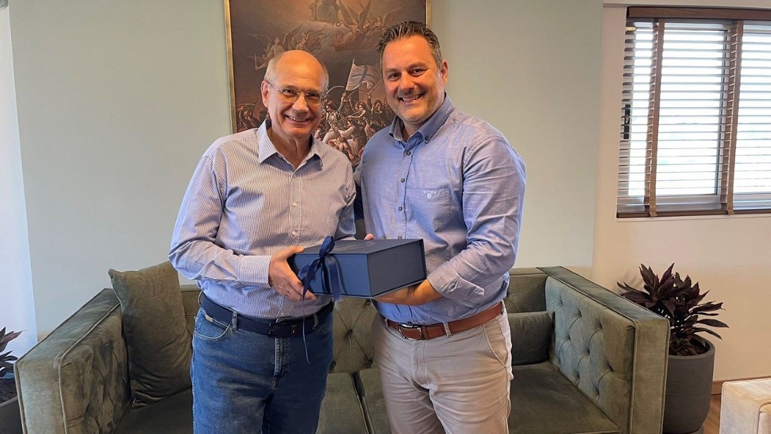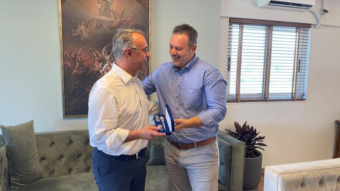 Ο Δήμαρχος Ιερής Πόλης Μεσολογγίου Σπύρος Διαμαντόπουλος υποδέχθηκε τον Υπουργό Υποδομών και Μεταφορών, Χρήστο Σταϊκούρα, στο γραφείο του στο Δημαρχείο σήμερα Πέμπτη, 18 Ιουλίου 2024.