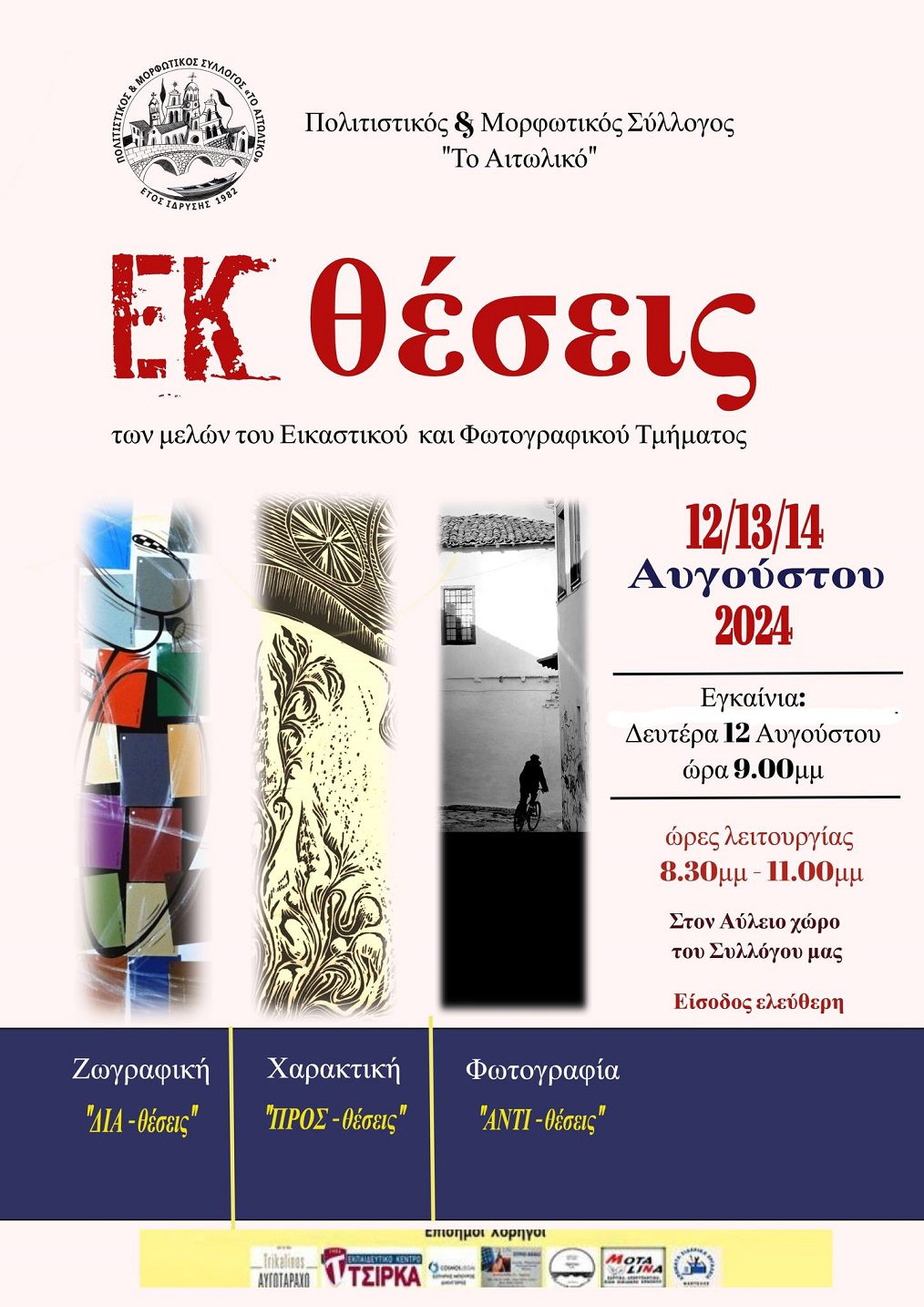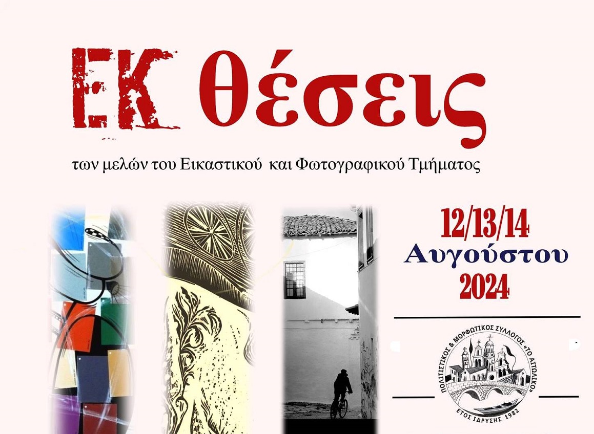 Ο Πολιτιστικός & Μορφωτικός Σύλλογος "Το Αιτωλικό" και τα Τμήματα Εικαστικών(Ζωγραφικής/Χαρακτικής) και Φωτογραφίας σας προσκαλούν στην εκδήλωση ΕΚθέσεις: "ΔΙΑ-θεσεις", "ΠΡΟΣ-θεσεις", "ΑΝΤΙ-θεσεις" από 12 έως 14 Αυγούστου, με τα εγκαίνια να πραγματοποιούνται, την προσεχή Δευτέρα 12/08 στις 9.00 το βράδυ.