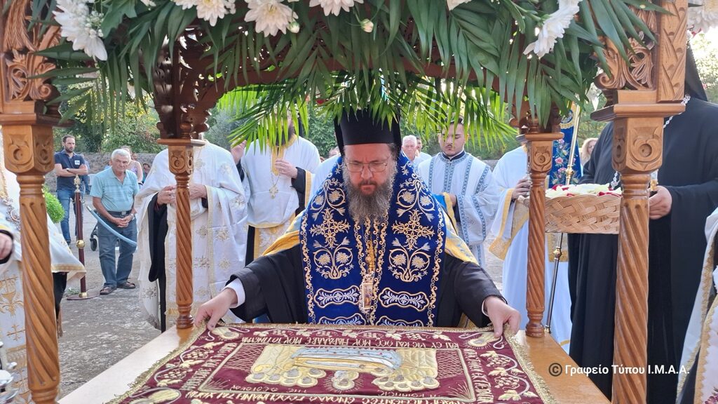 Ο Σεβασμιώτατος, αμέσως μετά την πανηγυρική υποδοχή στον προαύλιο χώρο της Μονής από τον Καθηγούμενο της Ιεράς Μονής, Αρχιμ. Αμβρόσιο Καλλιάφα και τους Ιερείς, μετέφερε λιτανευτικά τον Επιτάφιο της Παναγίας από το Καθολικό της Μονής και τον εναπέθεσε στο ευτρεπισμένο Κουβούκλιο στον προαύλιο χώρο.