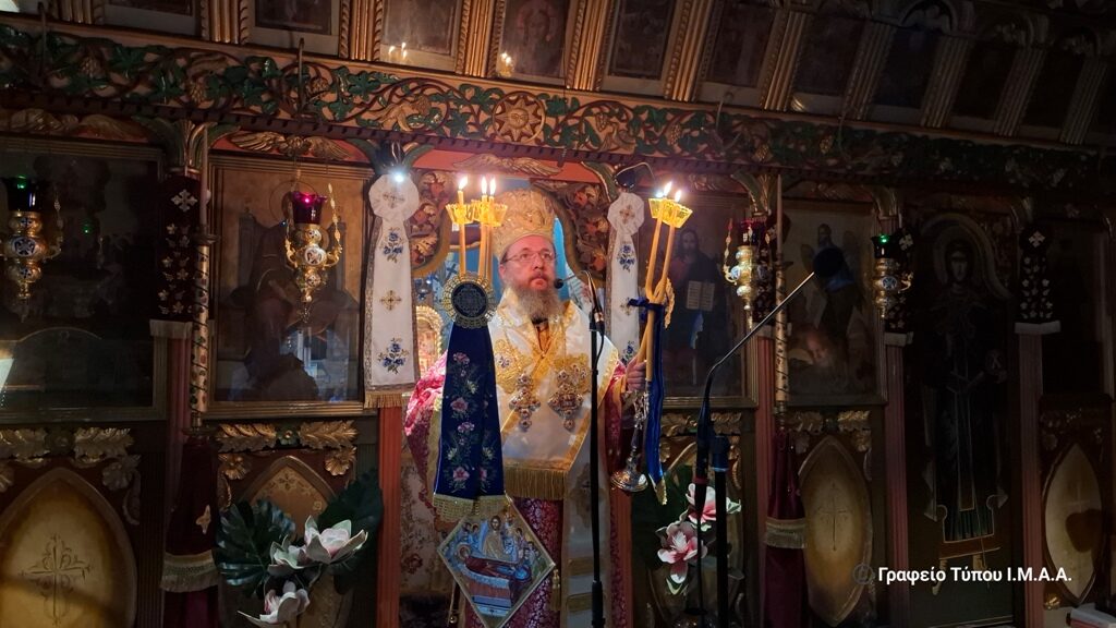 Ο Σεβασμιώτατος ανέλυσε τον ύμνο της ακολουθίας: «Καὶ σὲ μεσίτριαν ἔχω, πρὸς τὸν φιλάνθρωπον Θεόν, μή μου ἐλέγξη τὰς πράξεις, ἐνώπιον τῶν Ἀγγέλων, παρακαλῶ σε, Παρθένε, βοήθησόν μοὶ ἐν τάχει». Τόνισε, ότι αυτός είναι ο ρόλος και η διαχρονική αποστολή της Παναγίας μας∙ να μεσιτεύει και να πρεσβεύει για όλους μας. Επίσης αναφέρθηκε στην φιλανθρωπία του Θεού, λέγοντας, ότι ο Θεός είναι φιλάνθρωπος, φιλεύσπλαχνος, μακρόθυμος και πολυέλεος. Ο Θεός δεν είναι δικαστής. Δεν είναι τιμωρός. Γι’ αυτό προσευχόμαστε να αναπαυτούμε μέσα στη φιλανθρωπία και μέσα στην αγάπη του Θεού.