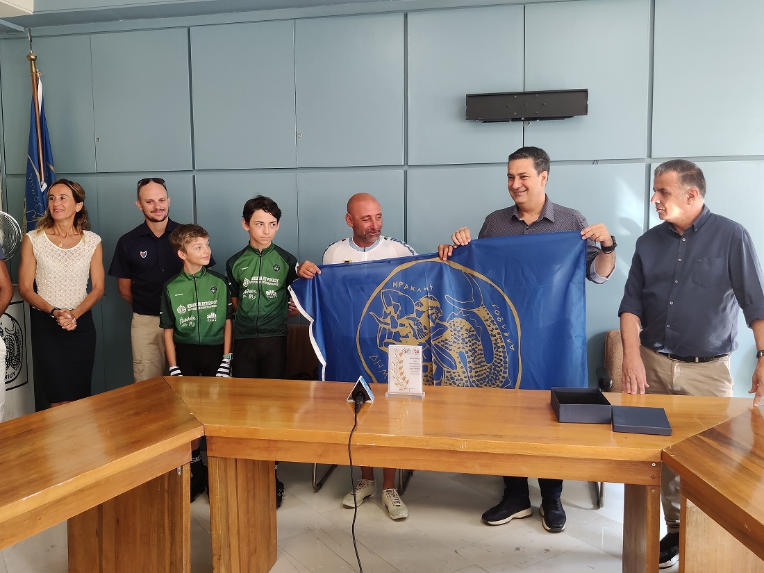 Τον αθλητή υποδέχτηκαν νεαροί ποδηλάτες του Γυμναστικού Πολιτιστικού Συλλόγου μαζί με τον προπονητή τους, Νώντα Λαμπρακόπουλο.