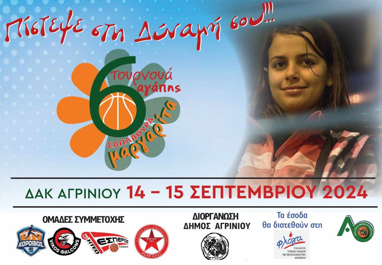 Για 6η συνεχόμενη χρονιά θα διοργανωθεί από το Δήμο Αγρινίου σε συνεργασία με τον Α.Ο. Αγρινίου το τουρνουά αγάπης "Μαργαρίτα Σαπλαούρα". Το τουρνουά που αποτελεί θεσμό για το μπάσκετ της πόλης μας θα διοργανωθεί στο κλειστό του ΔΑΚ Αγρινίου "Μιχάλης Κούσης" το Σαββατοκύριακο 14 και 15 Σεπτεμβρίου 2024.