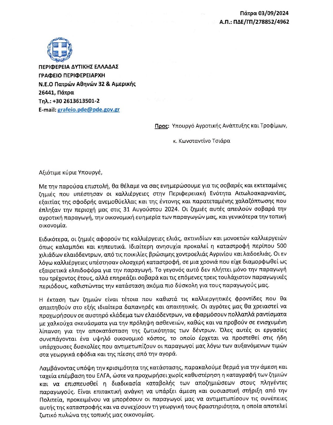Στις σοβαρές κι εκτεταμένες ζημιές που υπέστησαν από χαλαζόπτωση οι καλλιέργειες στην Π.Ε. Αιτωλοακαρνανίας αναφέρεται διεξοδικά ο Περιφερειάρχης Δυτικής Ελλάδος, Νεκτάριος Φαρμάκης, σε επιστολή που απέστειλε προς τον υπουργό Αγροτικής Ανάπτυξης, Κωνσταντίνο Τσιάρα.