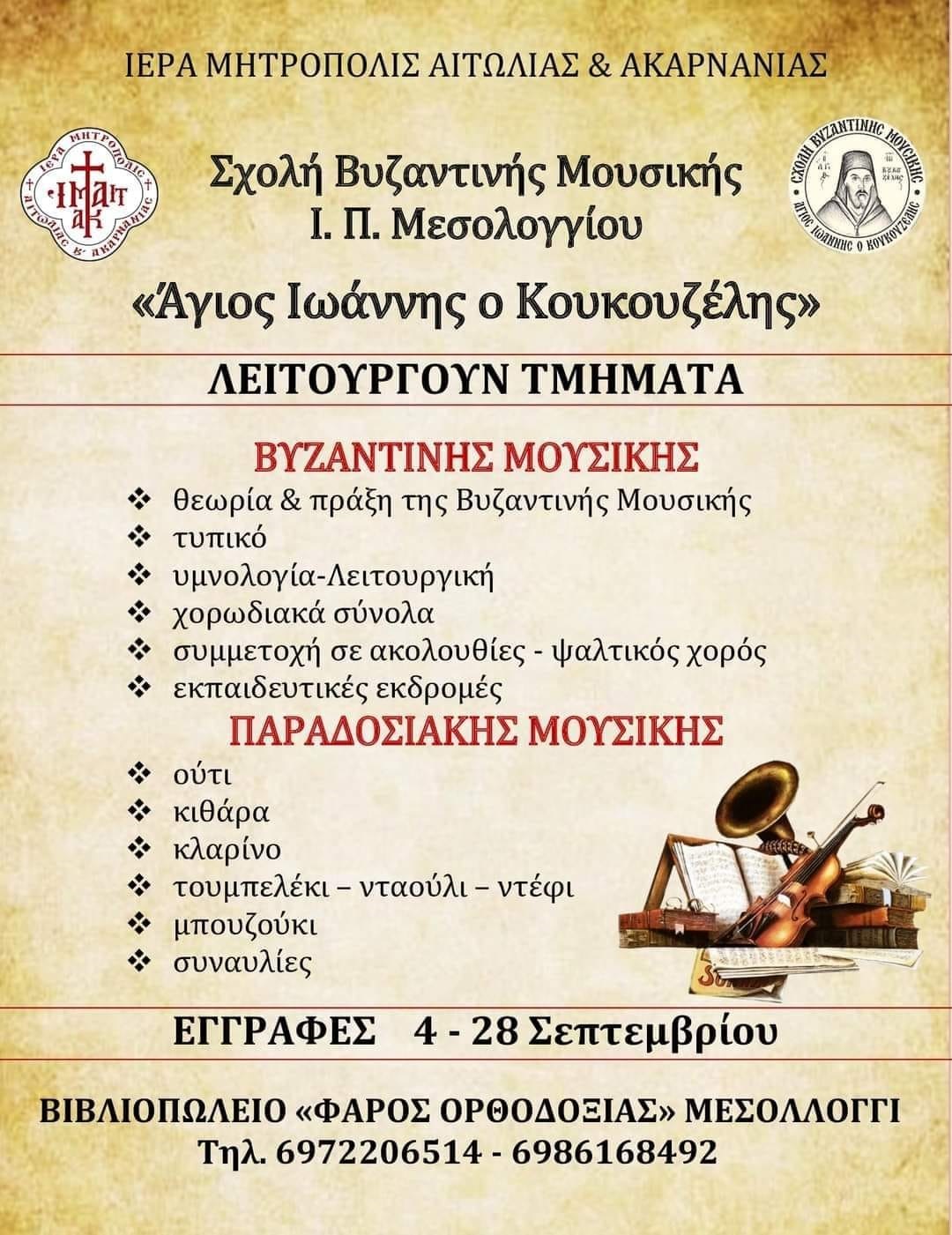 Άρχισαν επίσης, οι εγγραφές στη Σχολή Βυζαντινής Μουσικής «Άγιος Ιωάννης ο Κουκουζέλης» της Ιεράς Μητροπόλεως Αιτωλίας και Ακαρνανίας, με έδρα την Ιερά Πόλη του Μεσολογγίου.