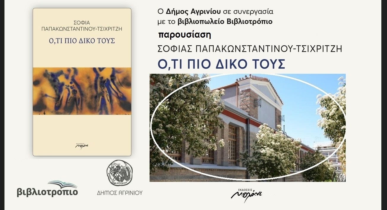 Ο Δήμος Αγρινίου σε συνεργασία με το Βιβλιοπωλείο «Βιβλιοτρόπιο» συνδιοργανώνουν την παρουσίαση της ποιητικής συλλογής της Σοφίας Παπακωνσταντίνου – Τσιχριτζή «Ό,τι πιο δικό τους» που θα πραγματοποιηθεί την Πέμπτη 19 Σεπτεμβρίου 2024, στις 20:00 στην Παλαιά Δημοτική Αγορά Αγρινίου.
