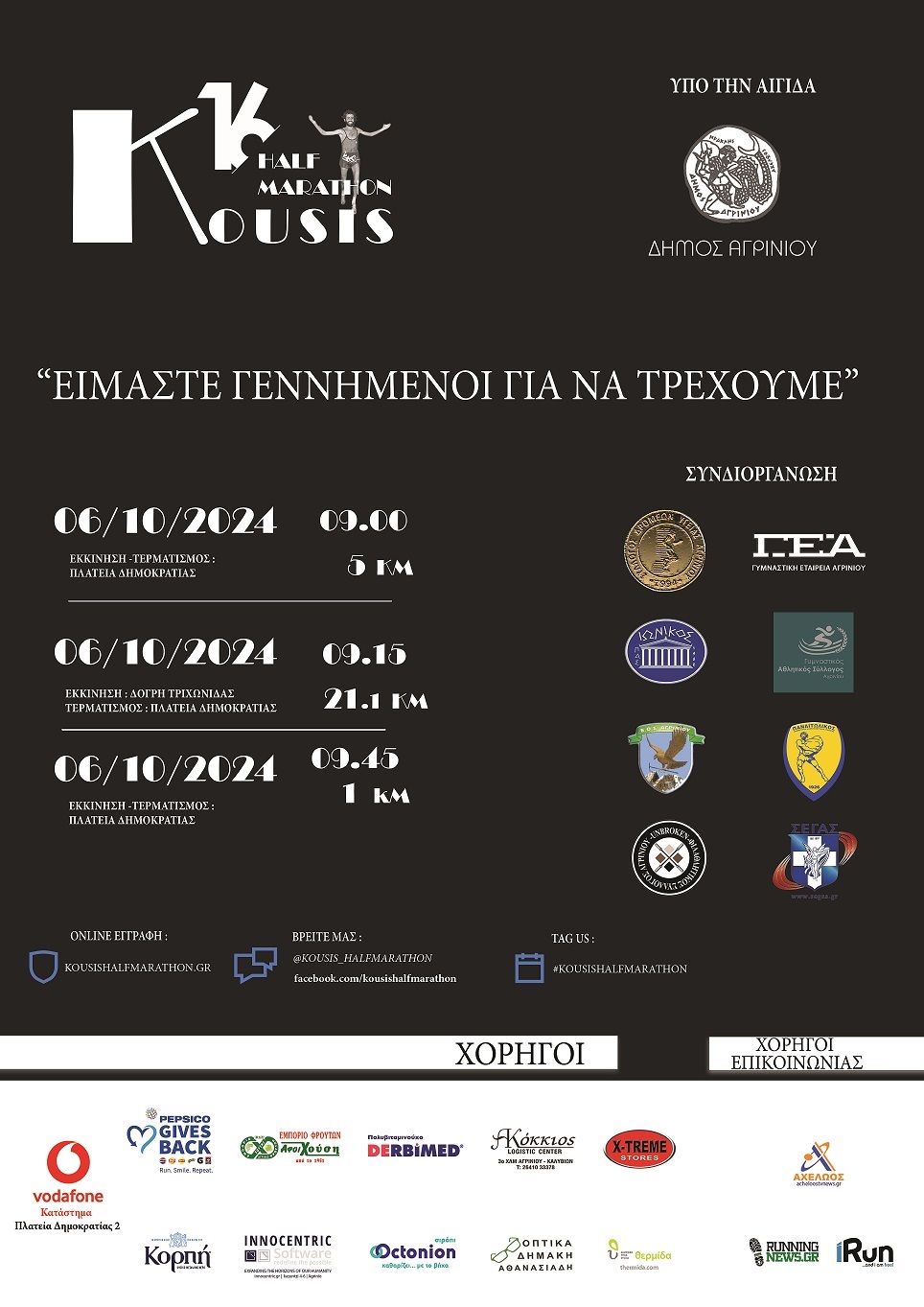 Οι εγγραφές θα γίνονται μόνο ηλεκτρονικά, μέχρι την Τετάρτη 02 Οκτωβρίου 2024, σε ειδική φόρμα εγγραφής σε ιστοσελίδα. : https://kousishalfmarathon.gr/registration_kousis2024/