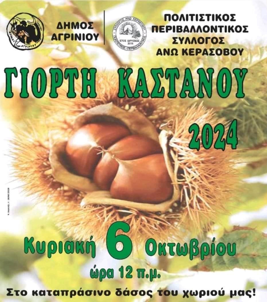 Να σημειώσουμε ότι, ο Δήμος Αγρινίου, η Δημοτική Κοινότητα Άνω Κερασόβου και ο Περιβαλλοντικός Σύλλογος, διοργανώνουν τη Γιορτή Κάστανου στις 6 Οκτωβρίου 2024 στο Άνω Κεράσοβο, με ώρα έναρξης στις 12 το μεσημέρι.