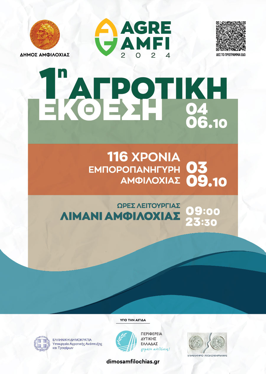 Η 1η Αγροτική Έκθεση «ΑgreAmfi» από 4 Έως 6 Οκτωβρίου είναι αφιερωμένη στην πλούσια αγροκτηνοτροφική παράδοση της Αμφιλοχίας, με ντόπιους εκπροσώπους του μεταποιητικού κλάδου και εκθέτες αγροτικών προϊόντων, όπως τα περίφημα τυροκομικά της Αμφιλοχίας, ελιές, μέλι, τραχανά, γλυκά του κουταλιού καθώς και εκθέτες του αγροτικού – γεωργικού κλάδου με γεωργικά μηχανήματα και εξοπλισμό.