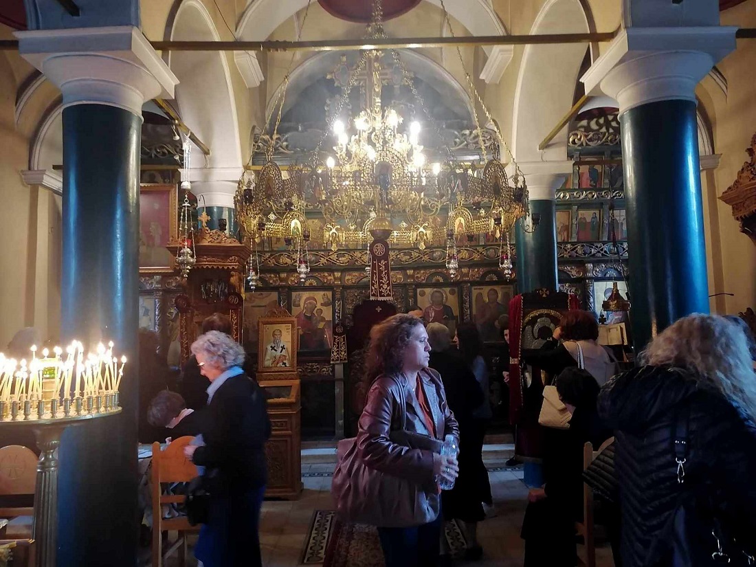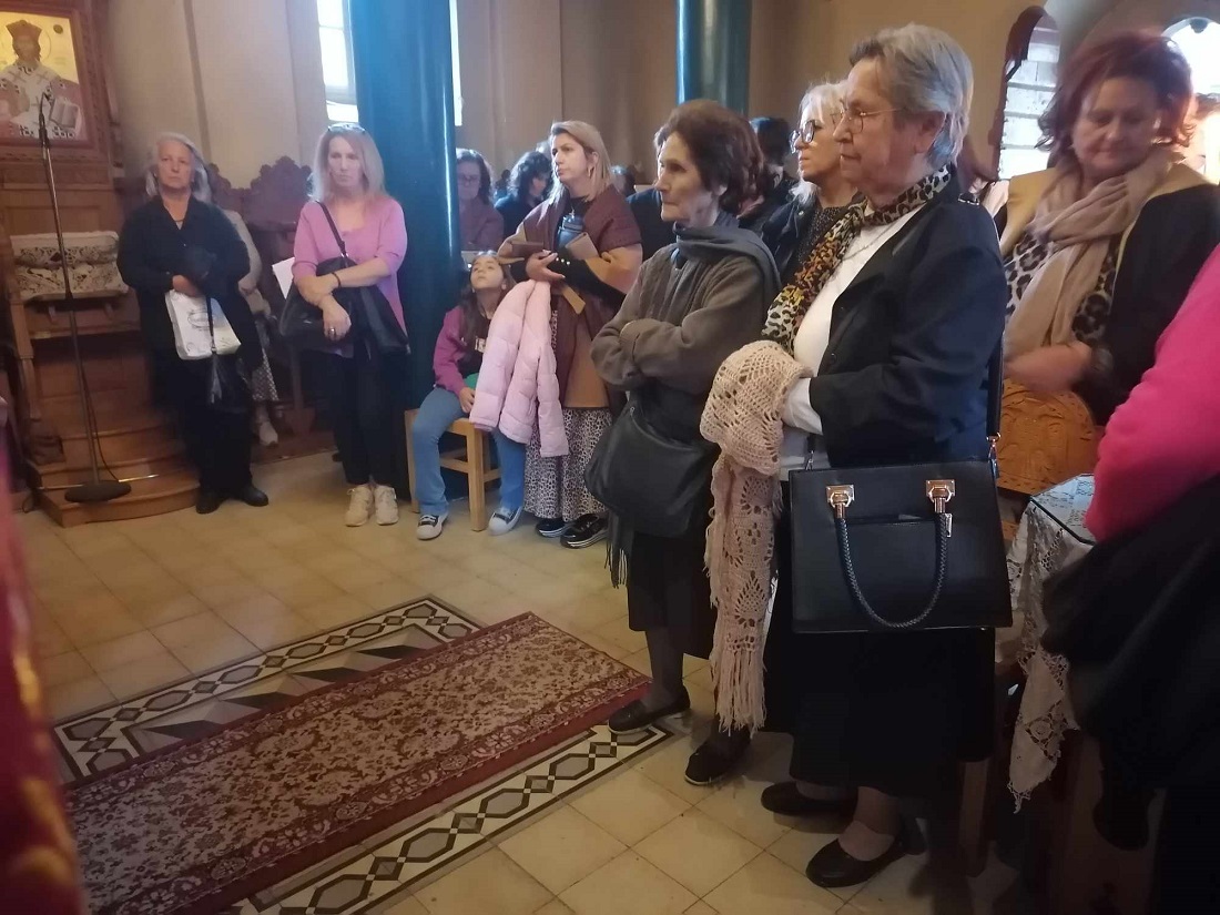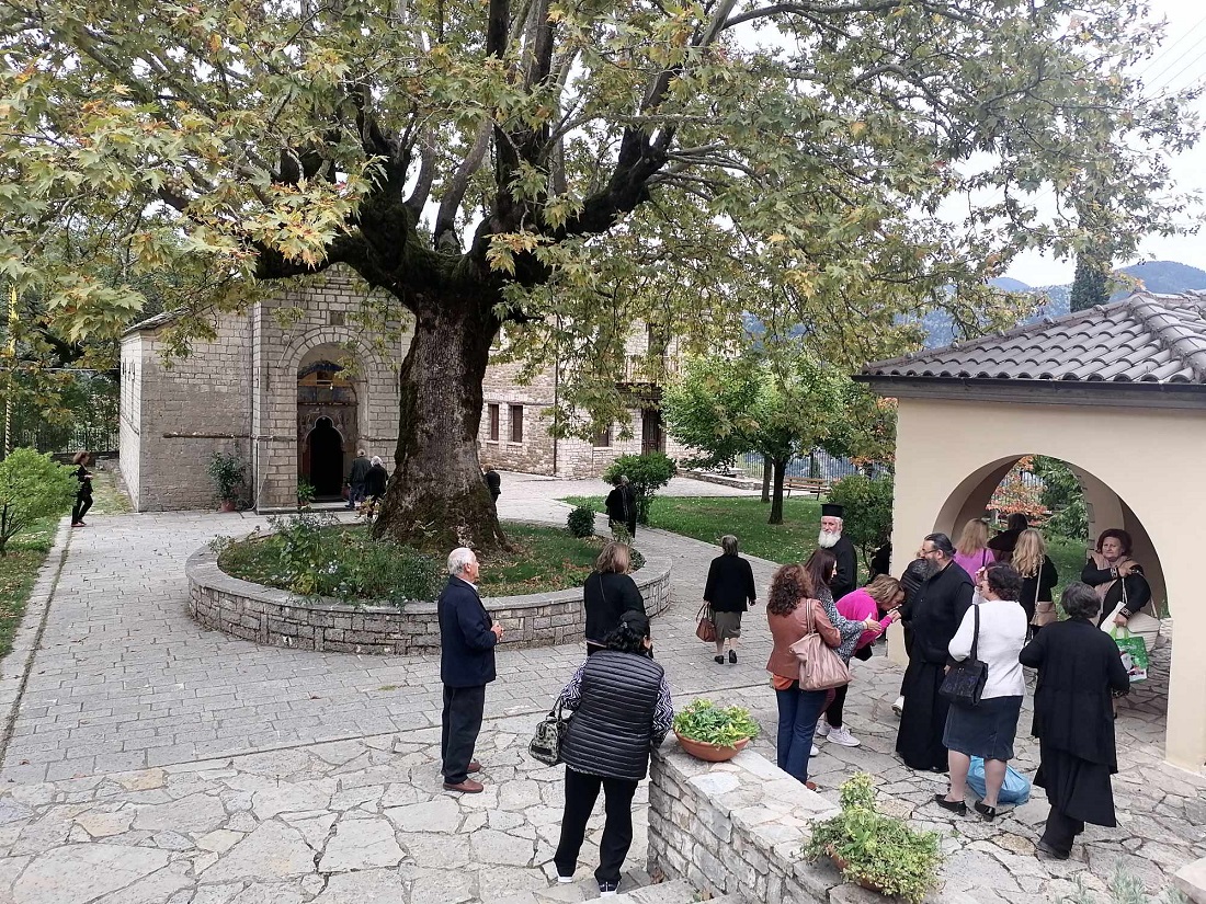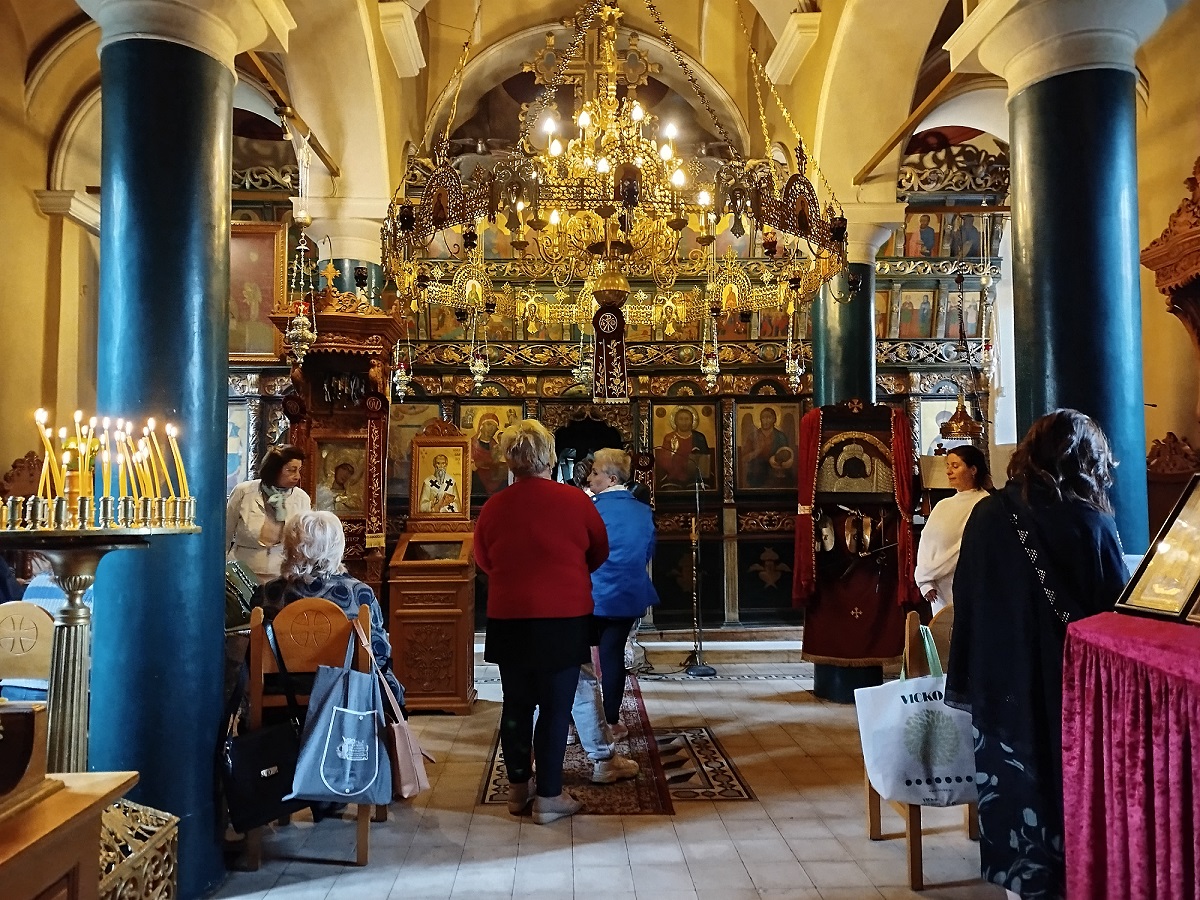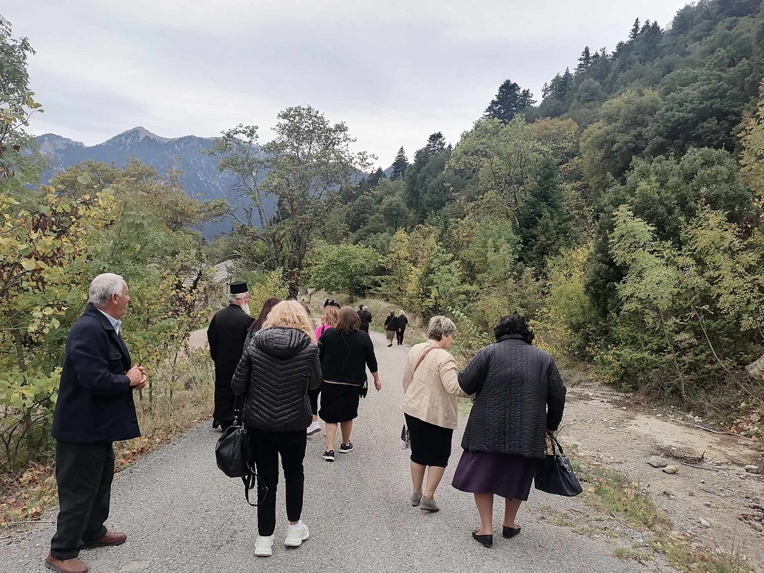 Οι επισκέπτες με επικεφαλής τον πατέρα Θεοδόσιο Αθανασόπουλο, άναψαν κεριά στον ιερό ναό και προσκύνησαν την θαυματουργή εικόνα της Παναγίας, το χέρι του Αγίου Πολυκάρπου που διατηρείται σε επιχρυσωμένη θήκη, καθώς και τα άλλα ιερά κειμήλια, ενώ ο Ηγούμενος της Ιεράς Μονής π. Πολύκαρπος, τους είπε ένα μικρό ιστορικό, ενώ κατόπιν διάβασε προσευχή και ευλόγησε με τη Χάρη του Τιμίου Σταυρού, τους πιστούς