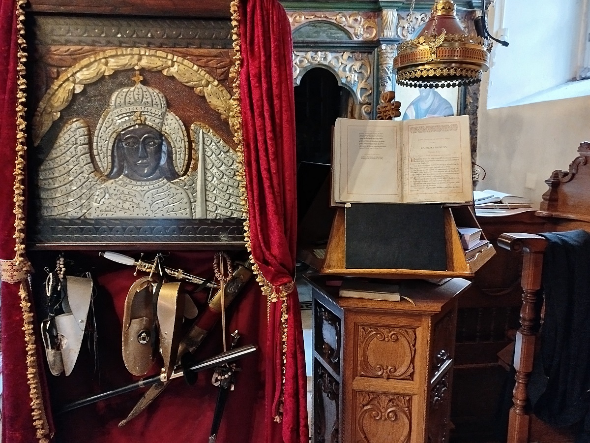 Μέσα στο ναό διασώζονται τα ιερά κειμήλια, τα οποία προσδίδουν τιμή και αίγλη στο Μοναστήρι. Είναι: