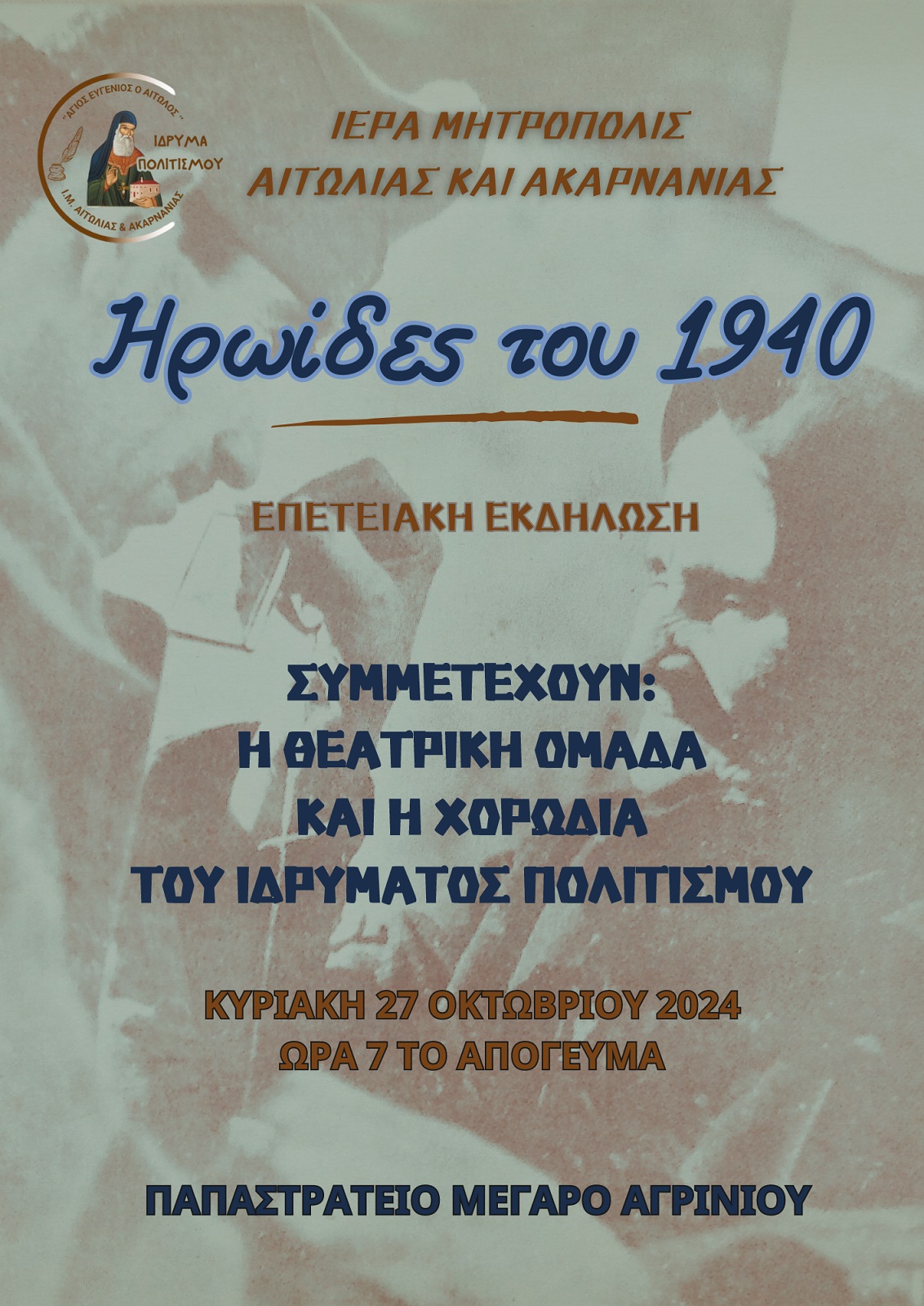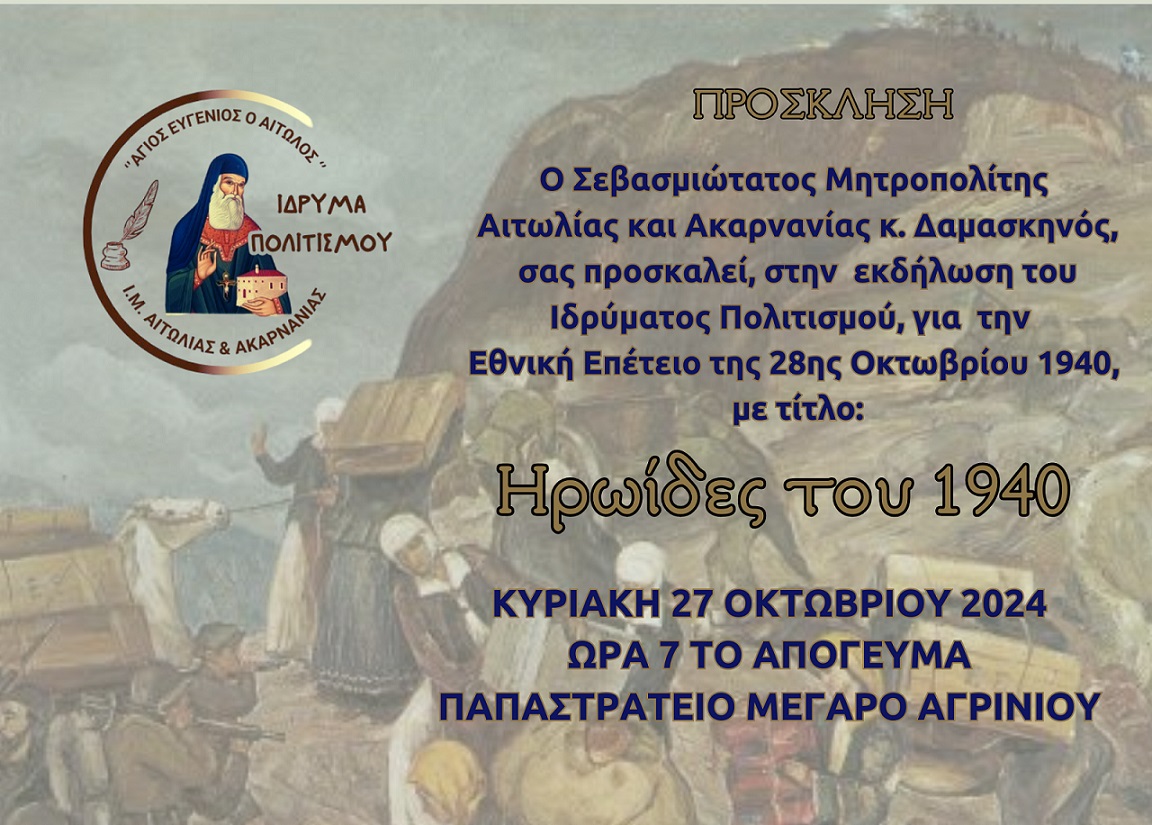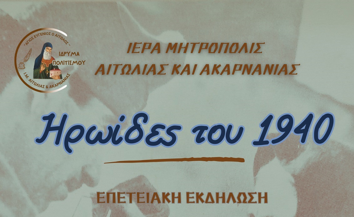 Η Ιερά Μητρόπολη Αιτωλίας & Ακαρνανίας και το Ίδρυμα Πολιτισμού «Άγιος Ευγένιος ο Αιτωλός» τιμώντας την ένδοξη εποποιία του 1940 διοργανώνουν επετειακή εκδήλωση με τίτλο: «Ηρωίδες του 1940».