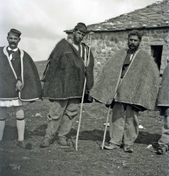 Στην δεύτερη φωτογραφία εποχής, διακρίνουμε βλαχοποιμένες, στο Σουροβίλι (σημ. Στράτο ) στα 1925, ενδεδυμένους με κάπα τύπου "capotini". Υπέροχη διαφάνεια από το ψηφιακό αρχείο της Χέλεν Ράδερφορντ στην Βρετανική Σχολή Αθηνών.