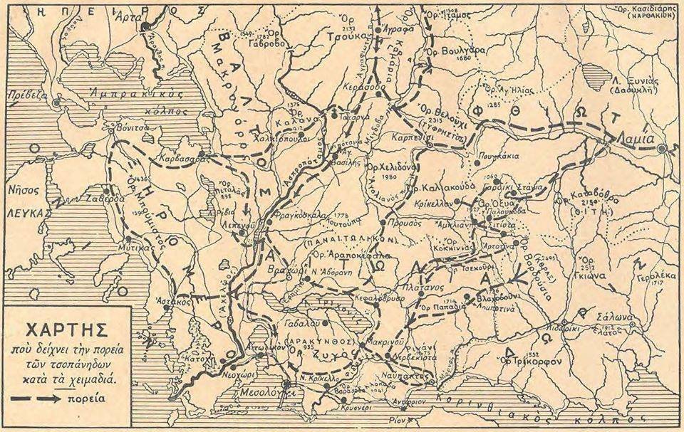 ….”Μιὰ ζωὴ, ὁλάκερο σκοινὶ ζωῆς βλάχικης τεντωμένο ἀπ᾿ τ᾿ Ἄγραφα πάνω ὦς τὰ ριζοβούνια τοῦ Βραχωριοῦ κάτω· κι ὥς πέρα τὸ Ξηρόμερο καὶ τῆς Λεπενοῦς τὸν κάμπο. Νὰ ἡ εἰκόνα στὸ κατέβασμα. Καὶ γιὰ νὰ τὴ μεγαλώσεις, τράβα την καὶ στὸν ἄλλον τὸ δρόμο ποὺ χωρίζοντας ἀπ᾿τὸ μεγάλο ντερβένι, περνάει τὴ Μαγούλα τῆς Τατάρνας, τὸ μεγάλο ἀπ᾿ τ᾿ Ἀληπασὰ τὸν καιρὸ γιοφύρι, ἀνεβαίνει στοὺς Χαλκιόπουλους, πίσω ἀπ᾿ τὴν Καλάνα, καὶ πέφτει Καρβασαρὰ καὶ Βόνιτσα πέρα. Τέντωσ᾿ τὴν καὶ κατὰ τῆς Καρδίτσας τὰ μέρη, κόλλησε καὶ τὴν ἄλλη, τὴν ὅμοια εἰκόνα ποὺ βλέπεις στὸ μεγάλο τὸ ντερβένι, ποὺ περνάει τὸν Ἀγραφιώτη, ἀνεβαίνει τὸ Κεράσοβο, διαβαίνει τῆς Μέγδοβας τὸ γεφύρι, ἀνηφορίζει τὸ Βελούχι, πέφτει στὸ Καρπενήσι καὶ παίρνει τὸ μεγαλόδρομο, γιὰ τὴ Λαμία, καὶ τότε θὰ καταλάβεις τὶ πάει νὰ εἰπεῖ κατέβασμα τῶν βλάχων στὰ χειμαδιὰ. Ἐδῶ δὲν παραλείπω νὰ γράψω ὅπως μοῦ δηγήθη ὁ Ἀγραφιώτης τσέλιγγας Σαλαγιάννης στὴ Μίγδου τὸ κατέβασμα:«Ξεκινᾶμε ἀπὸ δῶ μὲ τὰ πράματα καὶ φτάνουμε τὸ βράδυ στὴν Κουφάλα (χωριό). Σταθμεύομε κεῖ. Τὴν ἄλλη μέρα περπατᾶμε καὶ φτάνουμε στὴ Βίνιανη· δεύτερος σταθμὸς κι ἐκεῖ. Σταίνουμε σκηνὲς ἀπὸ τραγόμαλλο φκειασμένες καὶ ξενυχτάει ἡ φαμελιά.