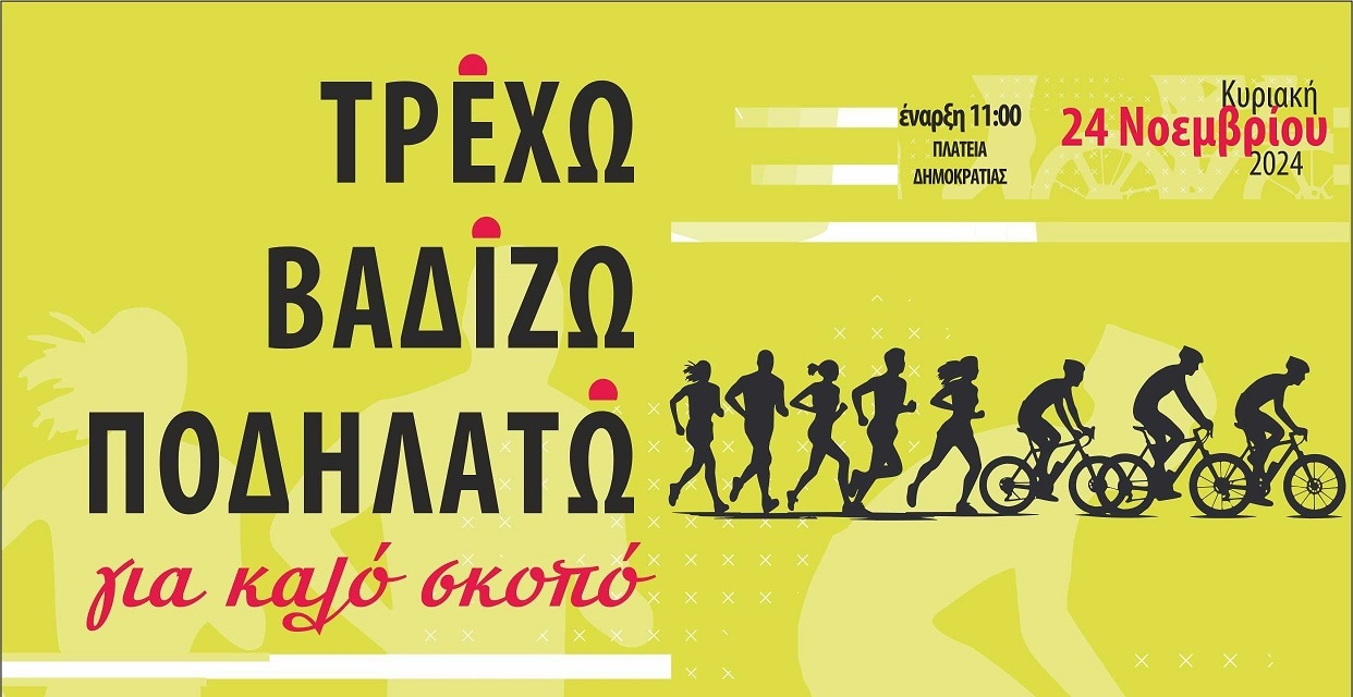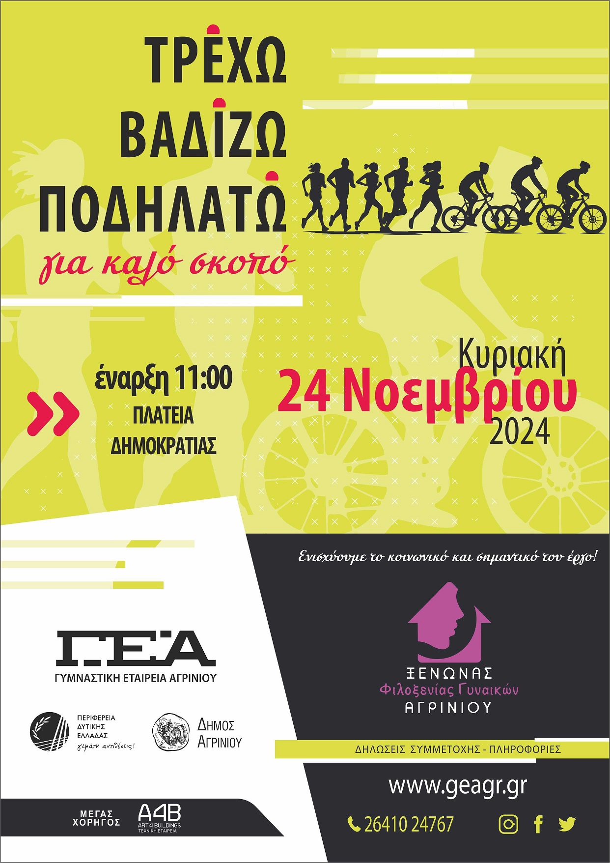 Ένα ξεχωριστό αθλητικό γεγονός, το «Τρέχω, βαδίζω, ποδηλατώ στην πόλη μου», διοργανώνουν την Κυριακή 24 Νοεμβρίου 2024 στις 11 το πρωί, η Γυμναστική Εταιρεία Αγρινίου (ΓΕΑ), η Περιφέρεια Δυτικής Ελλάδας και ο Δήμος Αγρινίου, ενώ οι σπουδαίες πρωταθλήτριες, Κατερίνα Θάνου και Φανή Χαλκιά, καλούν το κοινό να δώσει δυναμικό παρών και να ενισχύσει τον Ξενώνα Φιλοξενίας Γυναικών Αγρινίου!