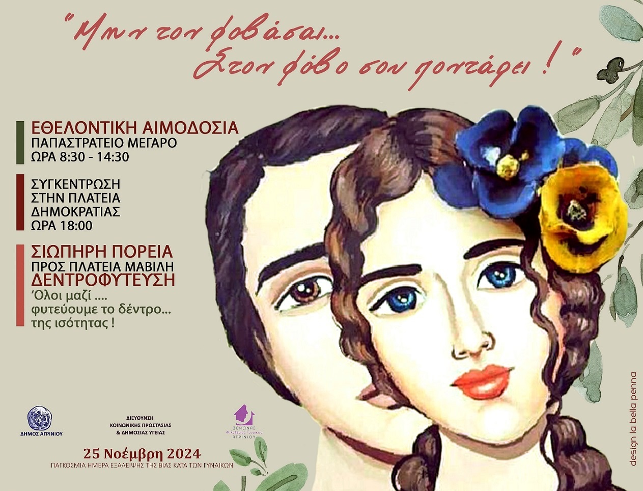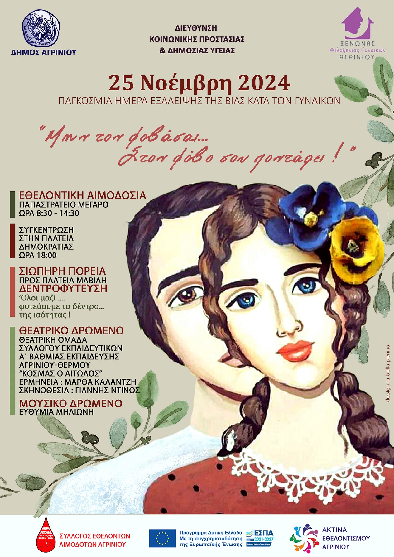 Ο Ξενώνας Φιλοξενίας Γυναικών, της Διεύθυνσης Κοινωνικής Προστασίας & Δημόσιας Υγείας Δήμου Αγρινίου, διοργανώνει εθελοντική αιμοδοσία σε συνεργασία με τον Σύλλογο Εθελοντών Αιμοδοτών και την Ακτίνα Εθελοντισμού, την Δευτέρα, 25 Νοεμβρίου και ώρα 08:30-14:30 μ.μ. στο Παπαστράτειο Μέγαρο Αγρινίου.