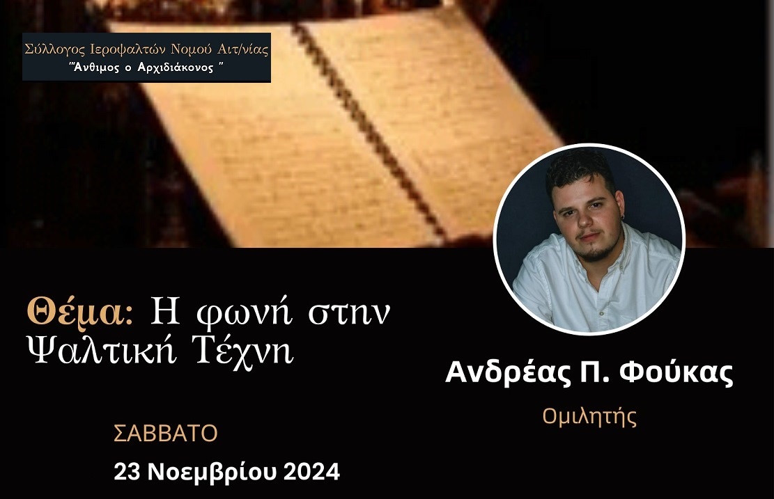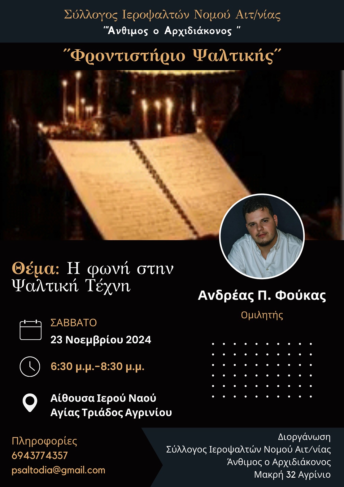 Το διοικητικό συμβούλιο του Συλλόγου Ιεροψαλτών Νομού Αιτωλ/νίας «Άνθιμος ο Αρχιδιάκονος» συνεχίζει για άλλη μια χρονιά την διοργάνωση των Φροντιστηρίων Ψαλτικής στην πόλη του Αγρινίου. Το πρώτο φροντιστήριο ψαλτικής θα πραγματοποιηθεί το προσεχές Σάββατο 23 Νοεμβρίου και ώρα 6:30 μ.μ. στην αίθουσα του Ι.Ν. Αγίας Τριάδος Αγρινίου, από τον Πρόεδρο του Συλλόγου Ιεροψαλτών κ. Ανδρέα Φούκα.