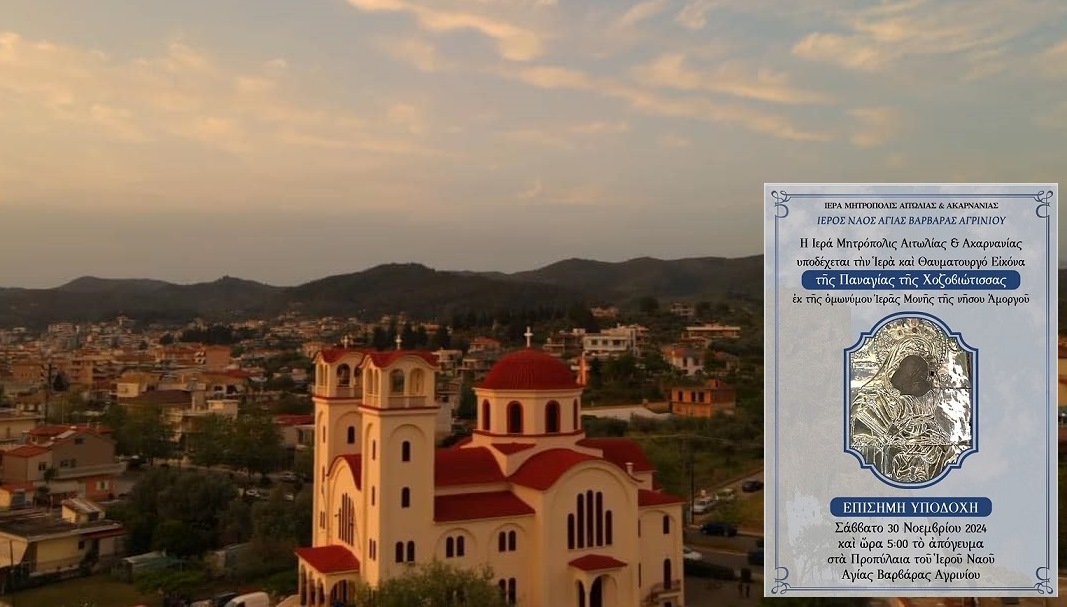 Την Ιερά και Θαυματουργό Εικόνα της Υπεραγίας Θεοτόκου, της Χοζοβιώτισσας, από την ομώνυμη Ιερά Μονή της Αμοργού, θα υποδεχθεί η Ιερά Μητρόπολη Αιτωλίας και Ακαρνανίας. Η επίσημη υποδοχή της Ιεράς Εικόνας θα πραγματοποιηθεί το Σάββατο 30 Νοεμβρίου 2024 και ώρα 5:00 το απόγευμα, στα προπύλαια του Ιερού Ναού Αγίας Βαρβάρας Αγρινίου από τον Σεβασμιώτατο Μητροπολίτη Αιτωλίας και Ακαρνανίας κ. Δαμασκηνό, επικεφαλής του Ιερού Κλήρου και του Λαού.