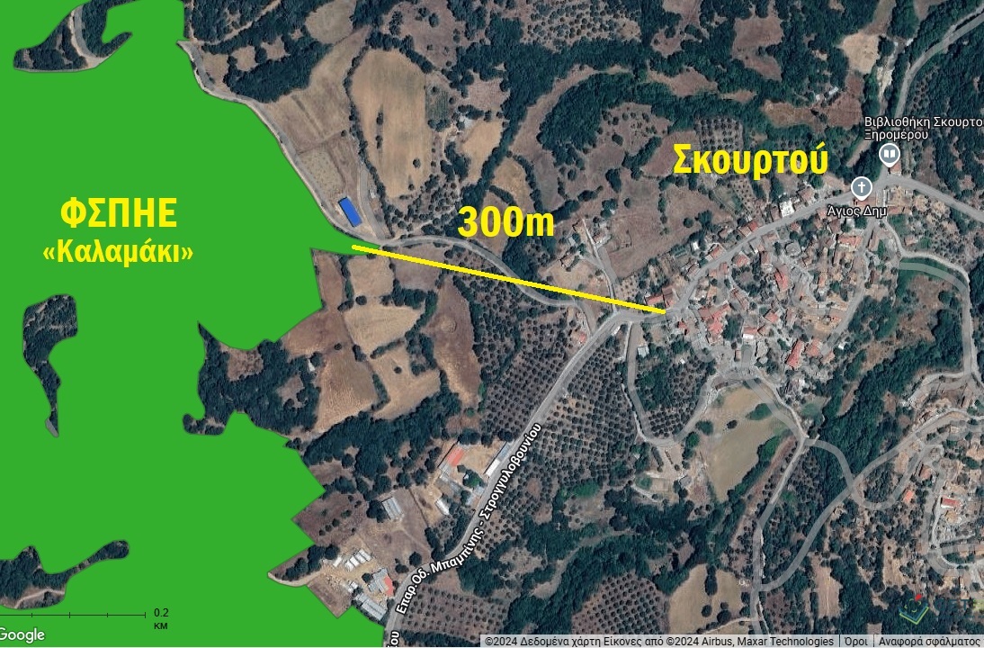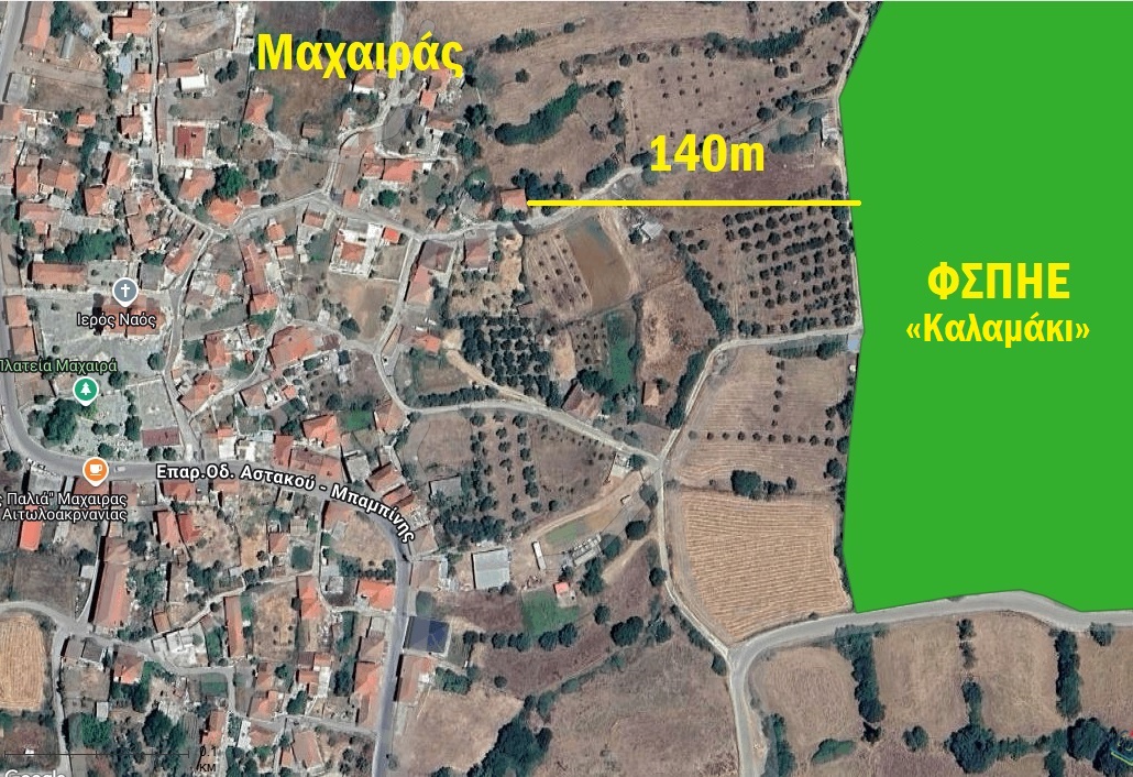 3) Θα βρίσκονται σε πολύ κοντινή απόσταση από τα χωριά: Μαχαιράς 140(!)μ., Μπαμπίνη 250μ., και Σκουρτού 300μ., κυριολεκτικά μπροστά από τις αυλές των σπιτιών!