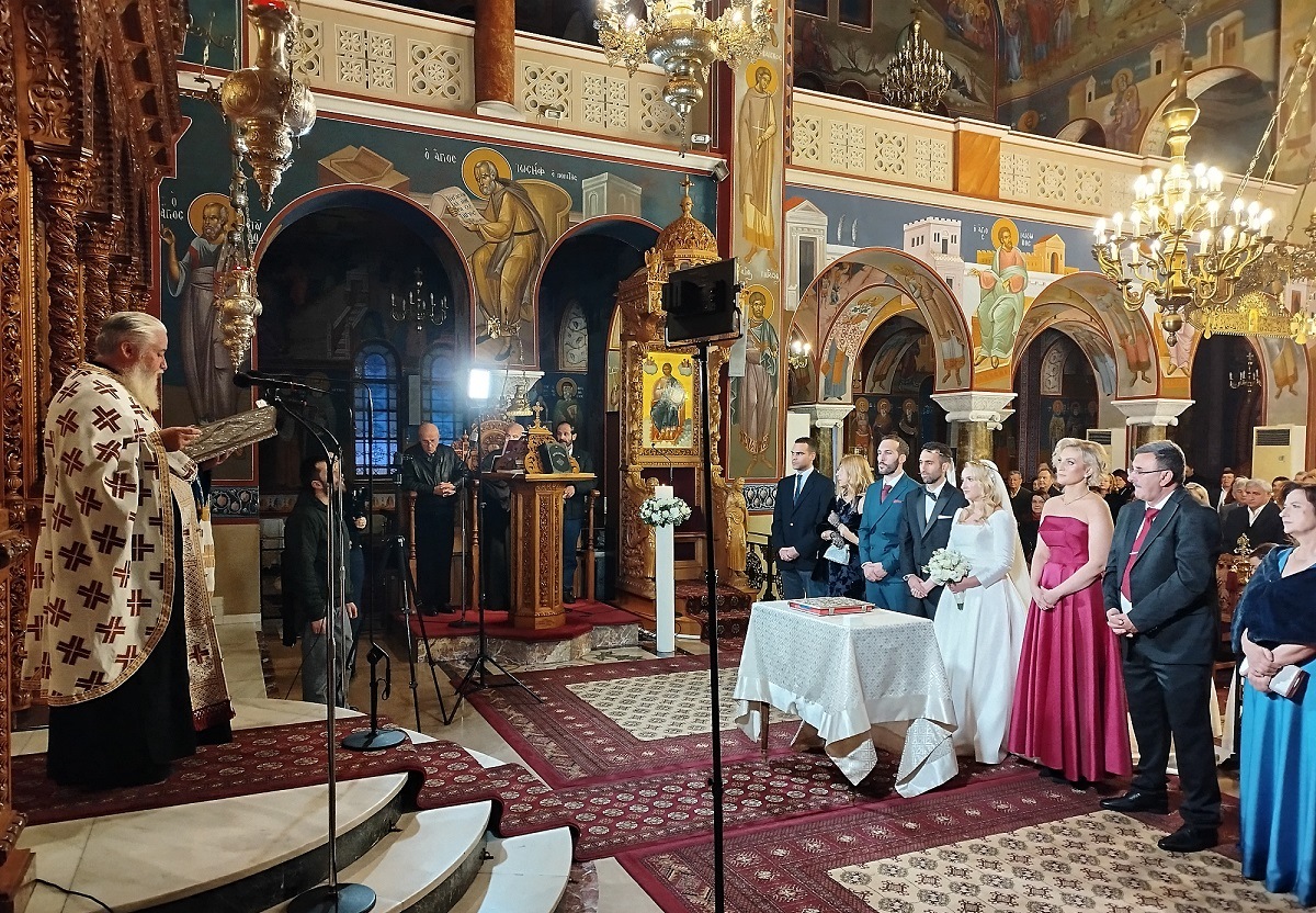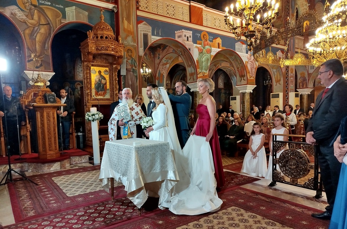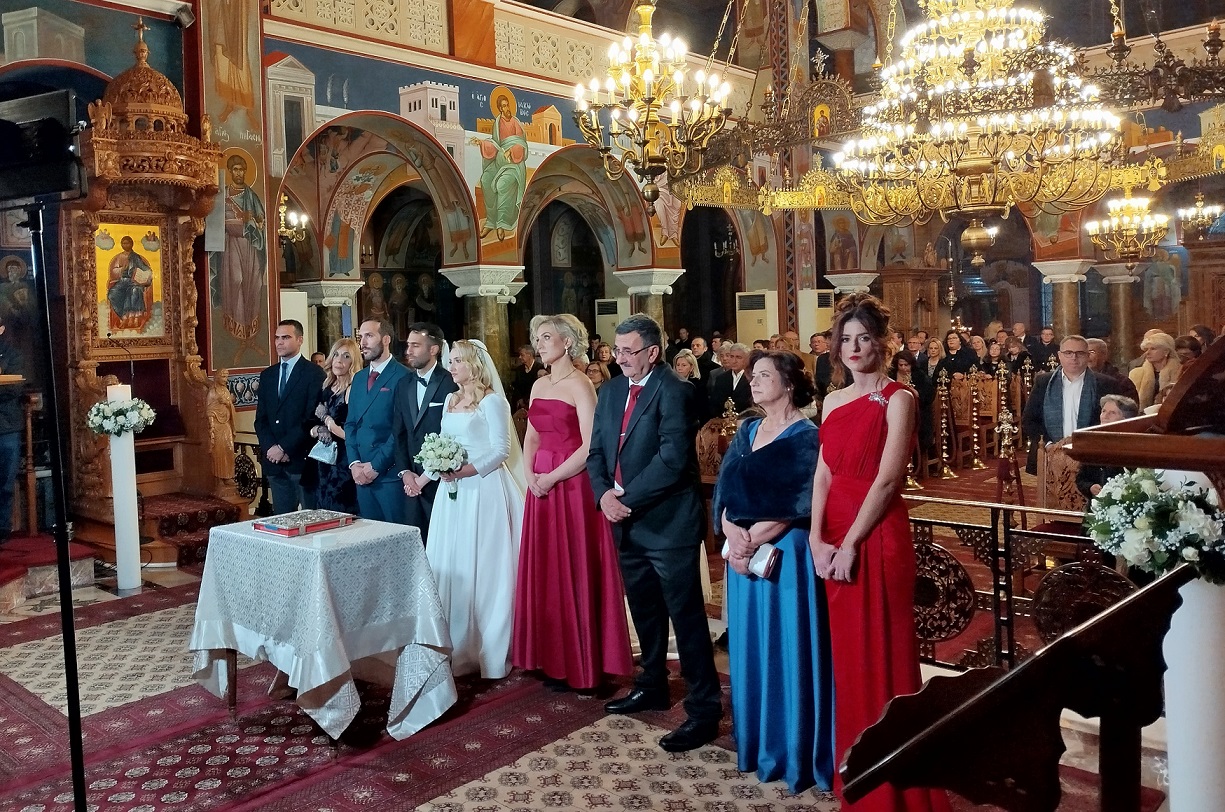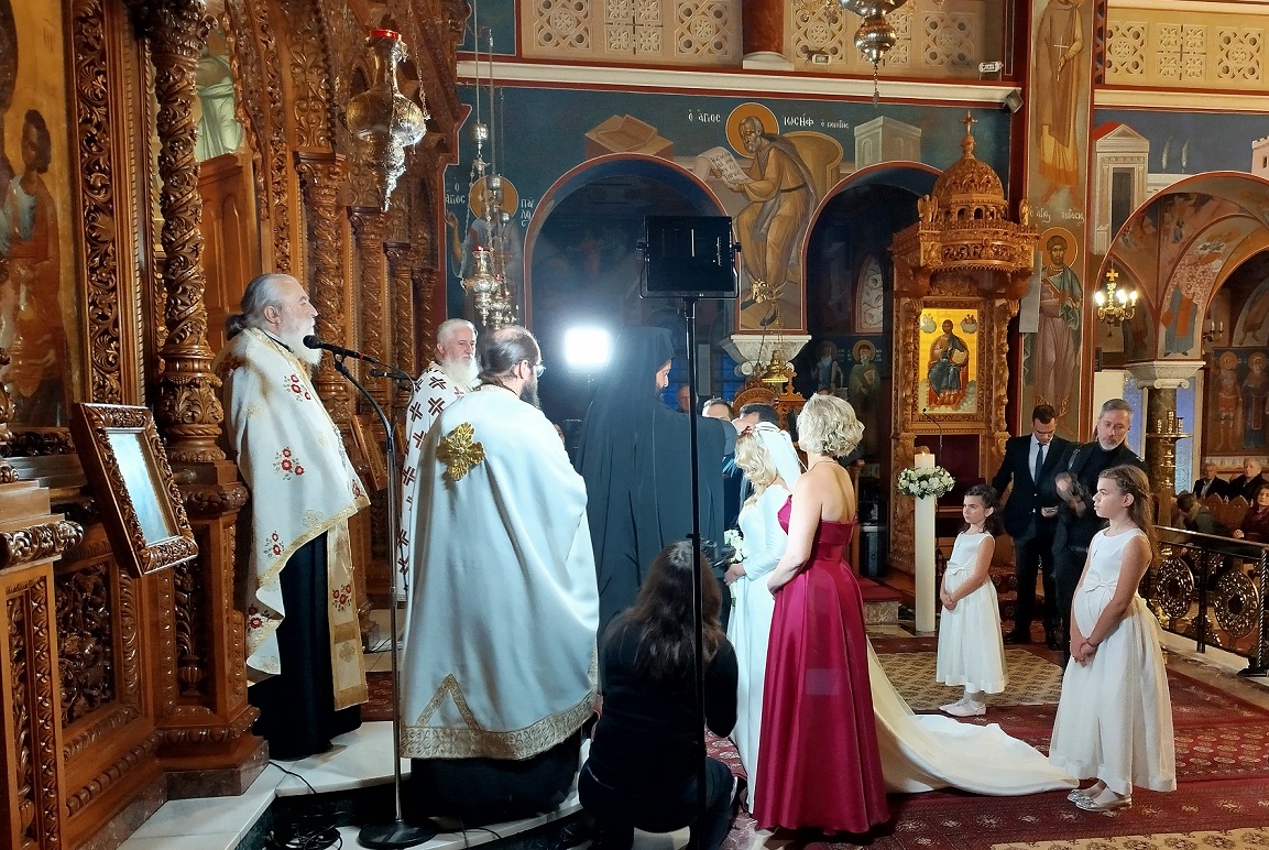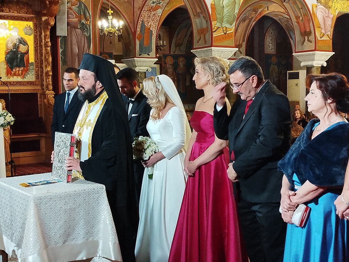 Στο μυστήριο χοροστάτησε ο Αρχιμανδρίτης π. Καλλίνικος Καζαντζής που συνλειτούργησε με τους ιερείς π. Αθανάσιο Κουλοχέρη, π. Θεοδόσιο Αθανασόπουλο και π. Κωνσταντίνο Σουλιώτη, παρουσία των αγαπημένων προσώπων από τις οικογένειες των νεονύμφων, συγγενών και πολλών προσκεκλημένων.