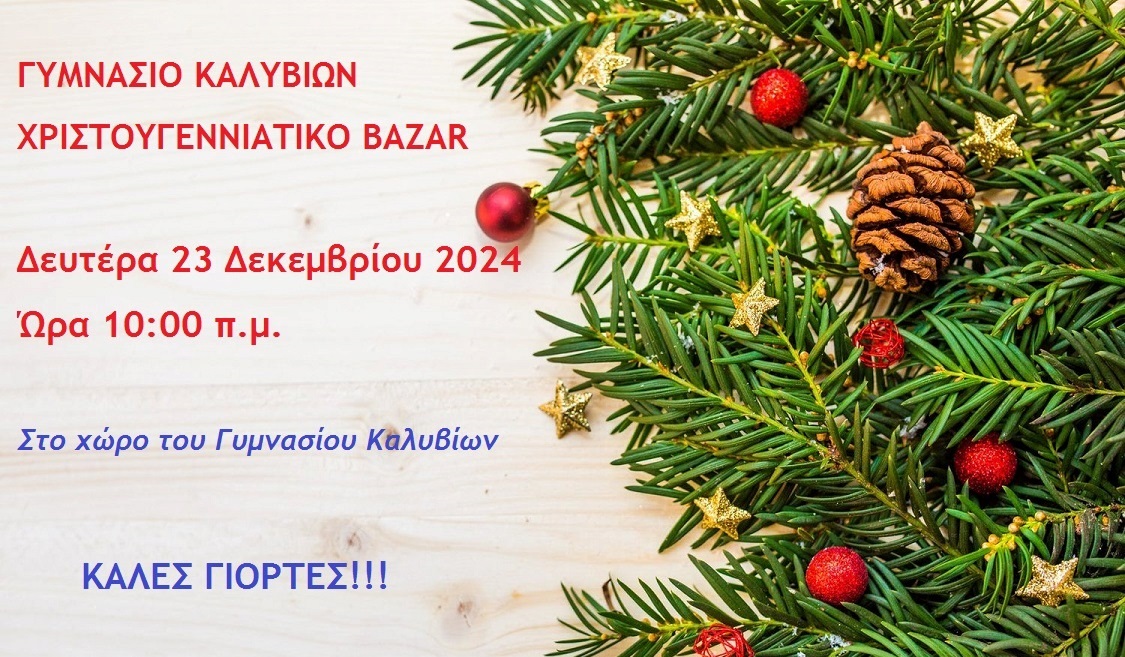 Σας περιμένουμε όλους την Δευτέρα 23-12-2024 και ώρα 10:00 π.μ. στο Γυμνάσιο Καλυβίων Αγρινίου να γιορτάσουμε τον ερχομό των Χριστουγέννων και να ενισχύσουμε το εορταστική αγορά (Bazaar) που διοργανώνουν η εκπαιδευτική κοινότητα του σχολείου, με την εθελοντική βοήθεια των Γονέων και Κηδεμόνων.