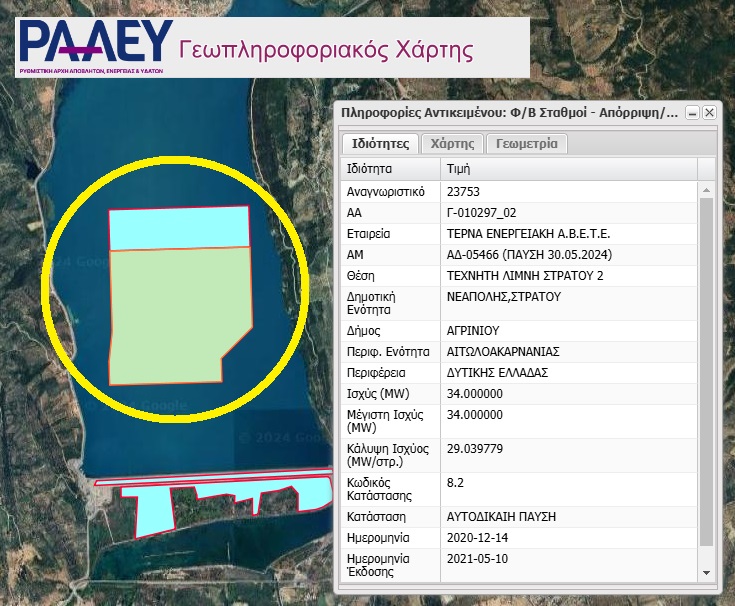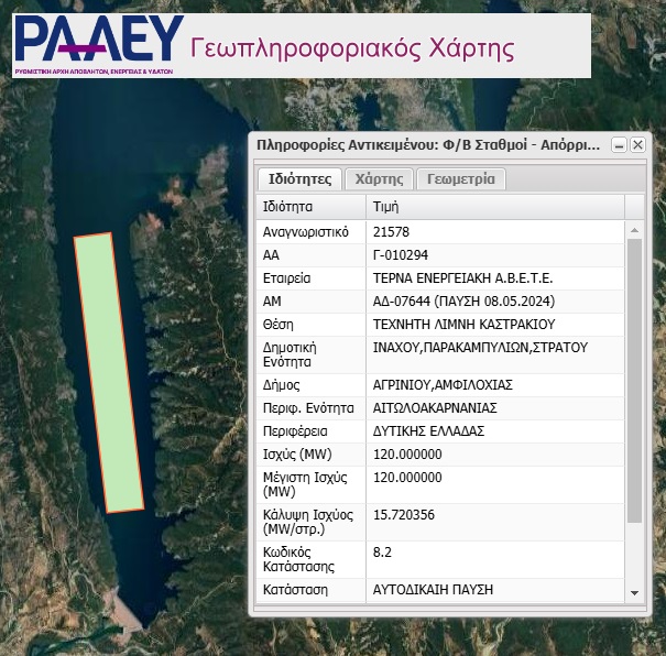 Για τον πλωτό φ/β σταθμό «Καστρακίου» η αυτοδίκαιη παύση ισχύος της βεβαίωσης παραγωγού απεικονίζεται με ημερομηνία 8-5-2024, στον χάρτης της ΡΑΑΕΥ, ενώ για το πλωτό φ/β «Στράτου» στις 30-5-2024.