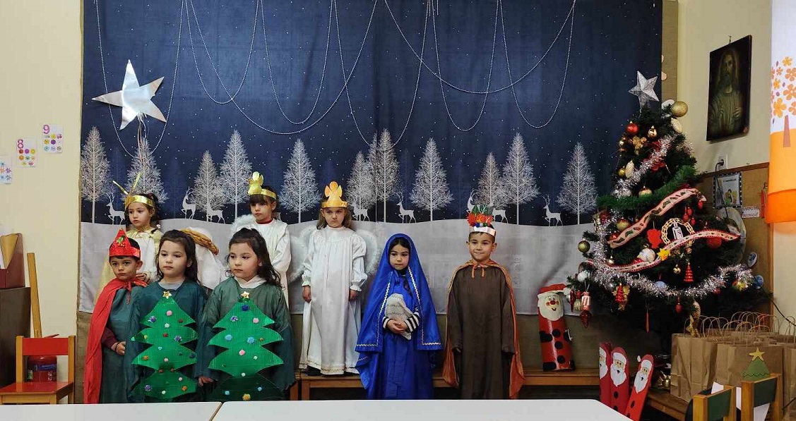 Τα μικρά παιδιά παρουσίασαν δίπλα στο στολισμένο χριστουγεννιάτικο δέντρο, την αναπαράσταση της γέννησης του μικρού Χριστού, που τον κρατούσε στην αγκαλιά της η Παναγία μας, με τους μικρούς αγγέλους να αγκαλιάζουν την ταπεινή φάτνη και οι τρεις Μάγοι με τα δώρα να προσκυνούν το Θείο Βρέφος!