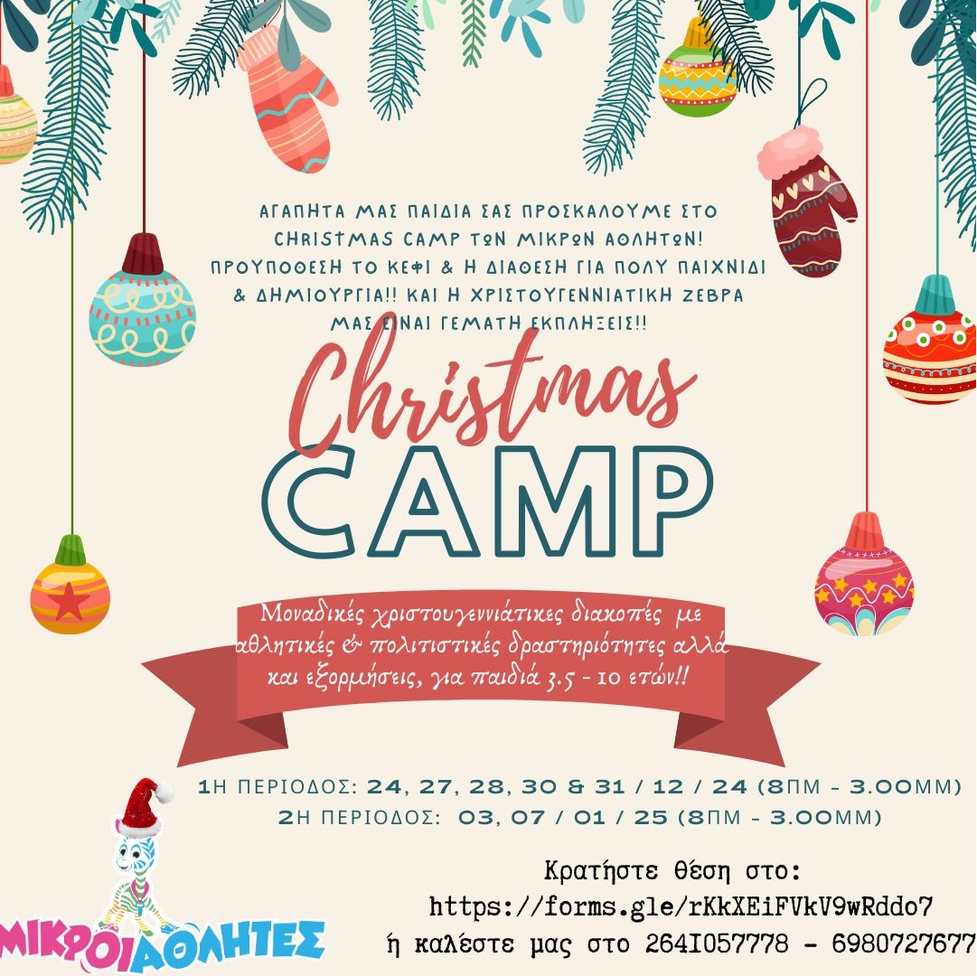 Το ΚΔΑΠ "Μικροί Αθλητές" στο Αγρίνιο, ενημερώνει τους γονείς ότι, την περίοδο των Χριστουγέννων, τις ημερομηνίες 24, 27, 28, 30 & 31/12/24 και 03 & 07/01/25, θα διεξαχθεί στον φιλόξενο χώρο του, αθλητικό - πολιτισμικό πρωινό Christmas Camp!