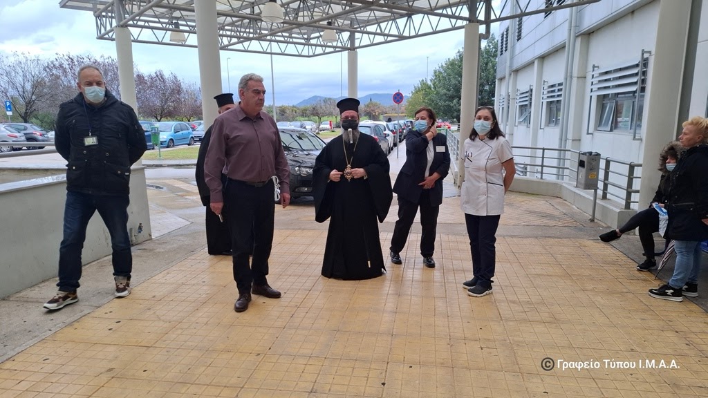 Αμέσως μετά επισκέφθηκε το Γενικό Νοσοκομείο Αγρινίου, συνοδευόμενος από τον Αρχιμ. Νεκτάριο Τριάντη, Υπεύθυνο Ποιμαντικής Μέριμνας του Νοσοκομείου, όπου έγινε δεκτός από τον Διευθυντή Διοικητικής Υπηρεσίας κ. Κωνσταντίνο Πατσιαλό, εκ μέρους του απουσιάζοντος Διοικητού. Ο Σεβασμιώτατος επισκέφθηκε τις κλινικές και ευχήθηκε στους νοσηλευομένους και τους συνοδούς τους, καθώς και στο ιατρικό και νοσηλευτικό προσωπικό.