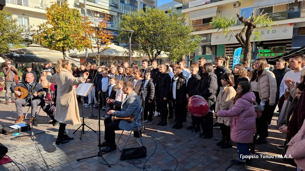 Η πρώτη ομάδα, με επικεφαλής τον Πρωτοπρ. Κωνσταντίνο Καντάνη, κατευθύνθηκε στην Πλατεία Δημοκρατίας, όπου έψαλλαν παραδοσιακά κάλαντα και τραγούδησαν χριστουγεννιάτικα και παραδοσιακά τραγούδια. Επίσης διένειμαν χριστουγεννιάτικες κάρτες και γλυκίσματα στους περαστικούς. Συμμετείχε η χορωδία των Ενοριών Αγίου Δημητρίου και Αγίου Νικολάου Καινουργίου, υπό την διεύθυνση της κ. Χριστίνας Τσουραπούλη. Στην κεντρική πλατεία βρέθηκε και ο Σεβασμιώτατος Ποιμενάρχης μας κ. Δαμασκηνός, ο οποίος συνεχάρη τα παιδιά για την όμορφη εκδήλωση και μίλησε στους ανθρώπους που είχαν συγκεντρωθεί λέγοντας ότι «σήμερα η ημέρα είναι αφιερωμένη στα αυθεντικά Χριστούγεννα. Τα Χριστούγεννα της γνήσιας ελληνικής παράδοσης. Όχι των ξενόφερτων εθίμων. Στα Χριστούγεννα, όπως μας τα παρέδωσαν οι πρόγονοί μας, που θέλησαν να τραγουδήσουν με όμορφο και παραδοσιακό τρόπο και μέσα από τα κάλαντα να παρουσιάσουν το θεολογικό νόημα αυτής της γιορτής. Το νόημα, ότι ο Χριστός μας προσφέρει την αληθινή και αυθεντική χαρά. Έτσι γιόρταζαν οι πρόγονοί μας, με την Εκκλησία και με την Θεία Λειτουργία, με το χριστουγεννιάτικο τραπέζι που ένωνε όλη την οικογένεια και με τα παραδοσιακά κάλαντα και τραγούδια, γιατί κάθε γιορτή της χριστιανοσύνης είναι και μια τοπική γιορτή που προσφέρει χαρά και ενότητα».
