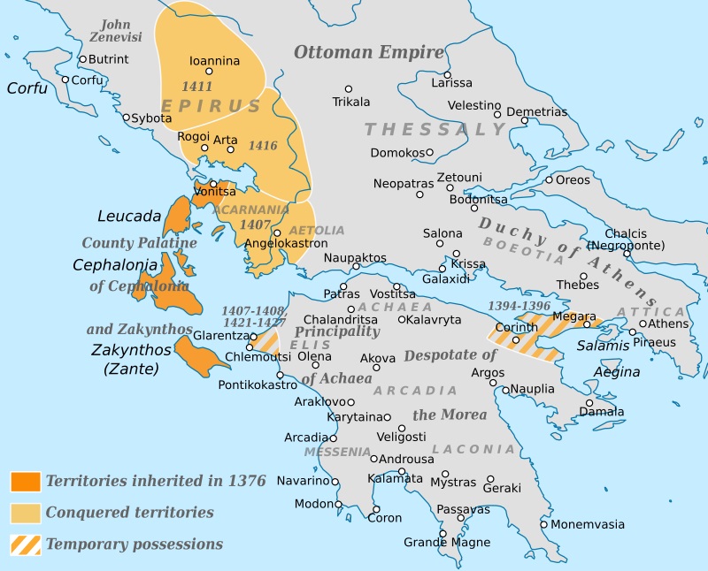 Ο χάρτης της Αιτωλοακαρνανίας πριν την Άλωση της Κωνσταντινούπολης. Πηγή: Constantine Plakidas -από https://commons.wikimedia.org/wiki/File:Conquests_of_Carlo_I_Tocco.svg