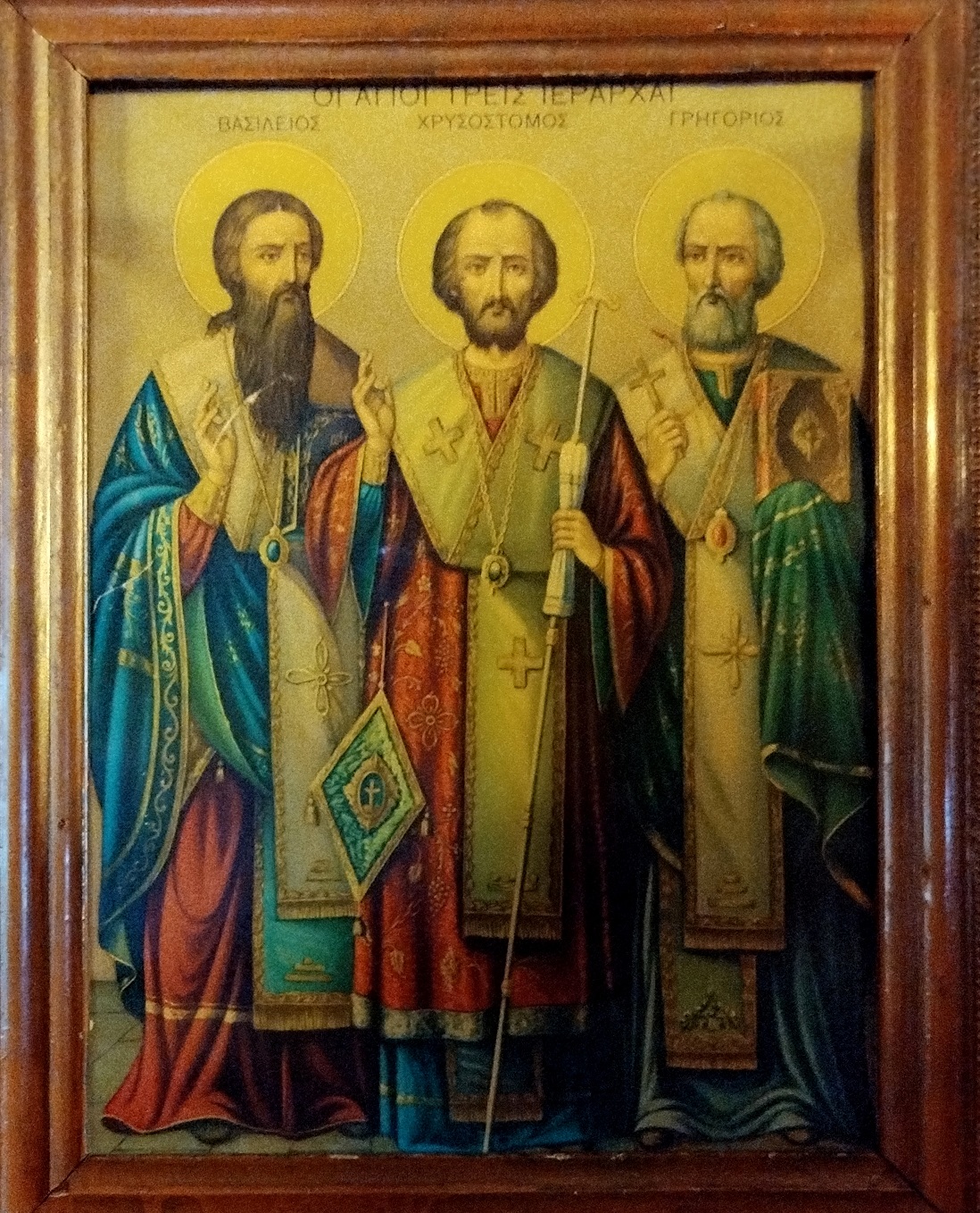«Τους τρεις μεγίστους φωστήρες της Τρισηλίου Θεότητος, τους την οικουμένην ακτίσι δογμάτων θείων πυρσεύσαντας τους μελιρρύτους ποταμούς της Σοφίας, τους την κτίσιν πάσαν θεογνωσίας νάμασι καταρδεύσαντας, Βασίλειον τον Μέγαν και τον Θεολόγον Γρηγόριον συν τον κλεινόν Ιωάννην τω την γλώτταν χρυσορρήμονι. Πάντες οι των λόγων αυτών ερασταί, συνελθόντες ύμνοις τιμήσωμεν˙ Αυτοί γαρ τη Τριάδι υπέρ ημών αεί πρεσβεύουσιν».