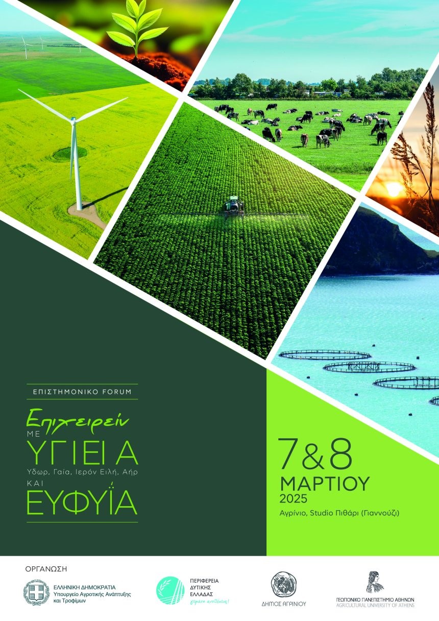 Επιστημονικό Forum υπό τον τίτλο «Επιχειρείν με «Υ-Γ-Ι-ΕΙ-Α»* και Ευφυία», θα πραγματοποιηθεί την Παρασκευή και το Σάββατο 7 & 8 Μαρτίου 2025. Η γεωργία, η κτηνοτροφία, η αλιεία, οι υδατοκαλλιέργειες και οι ανανεώσιμες πηγές ενέργειας στην εποχή της τεχνητής νοημοσύνης.